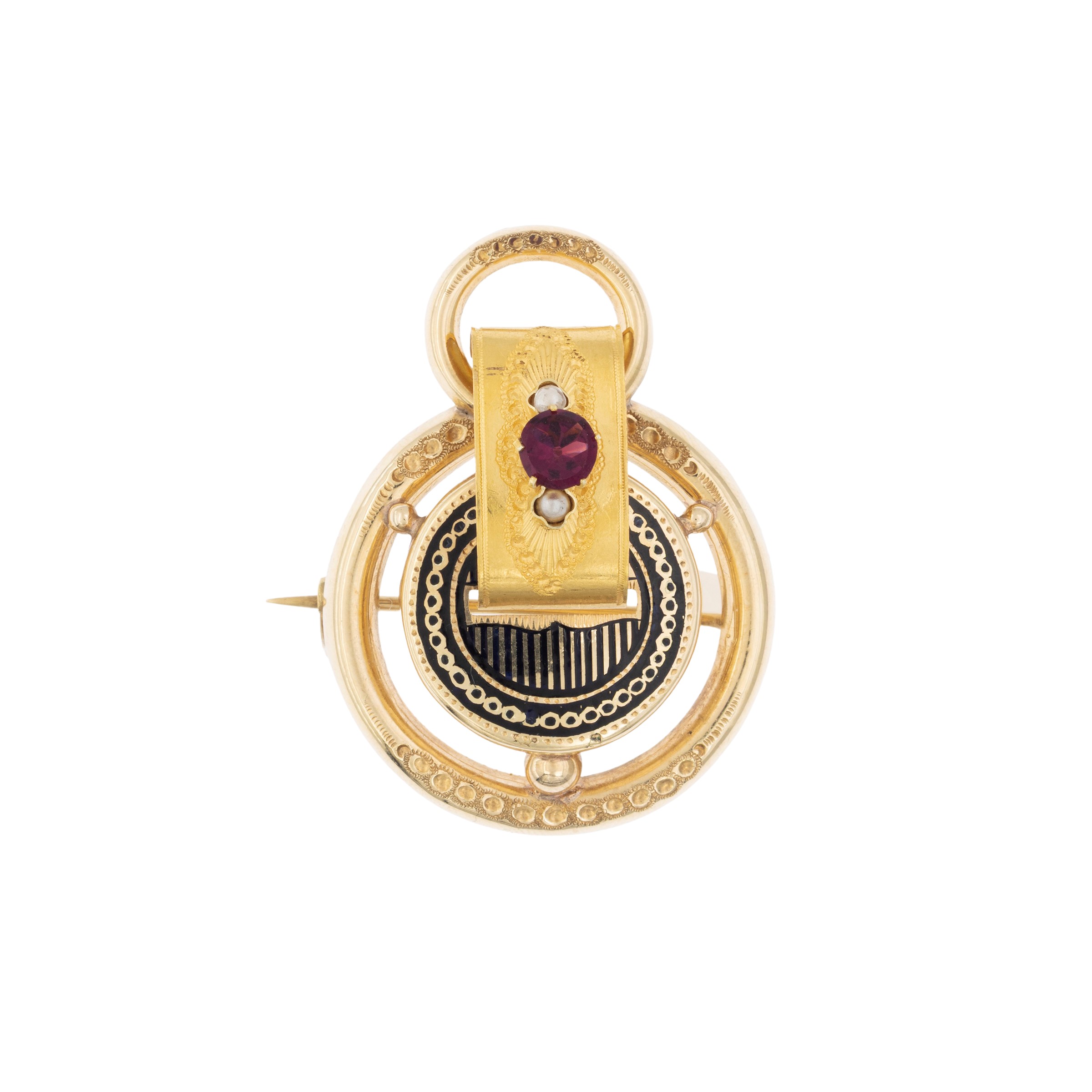 weight 9 g.black enamel, garnet and pearls, dimensions 4.5x3.1 cm.
