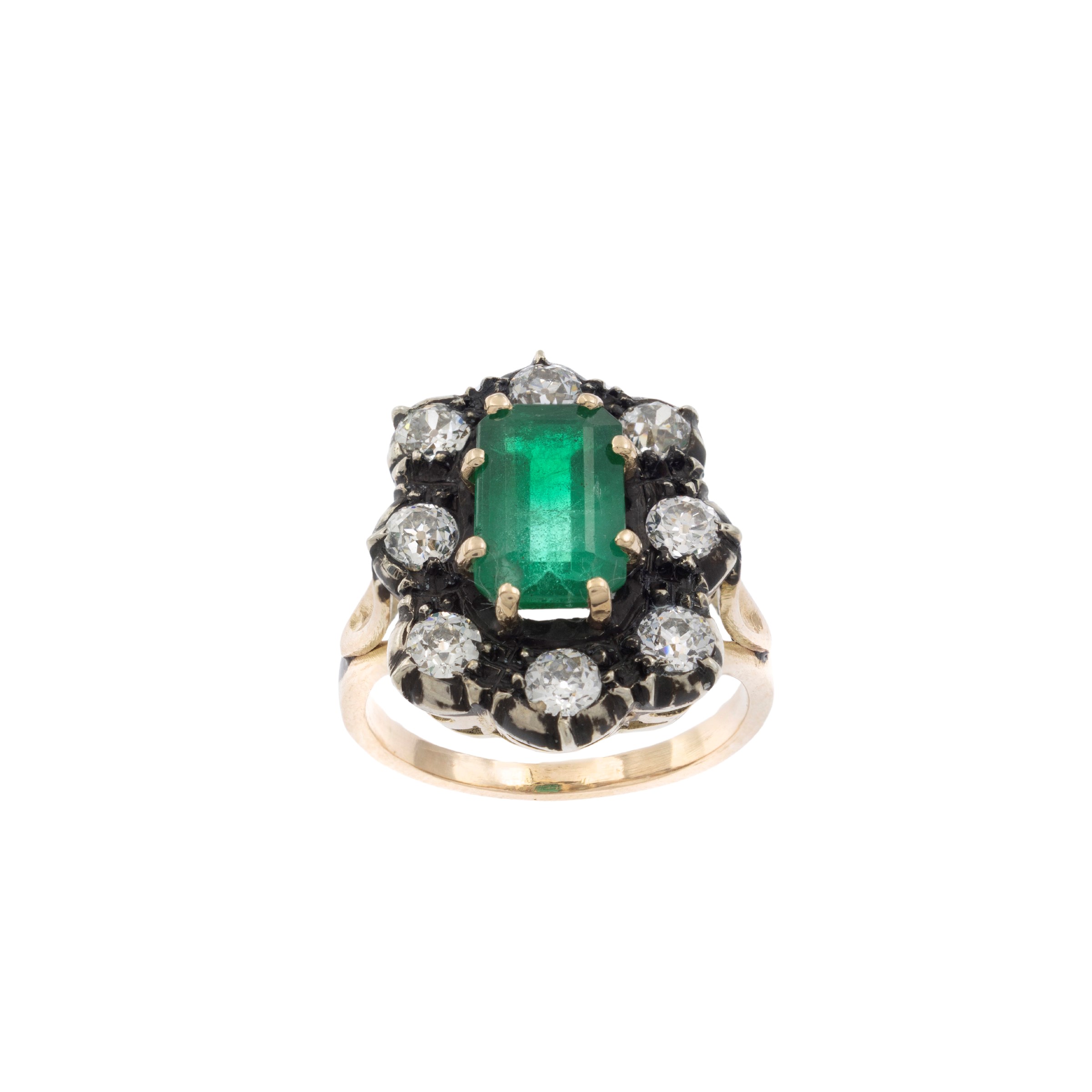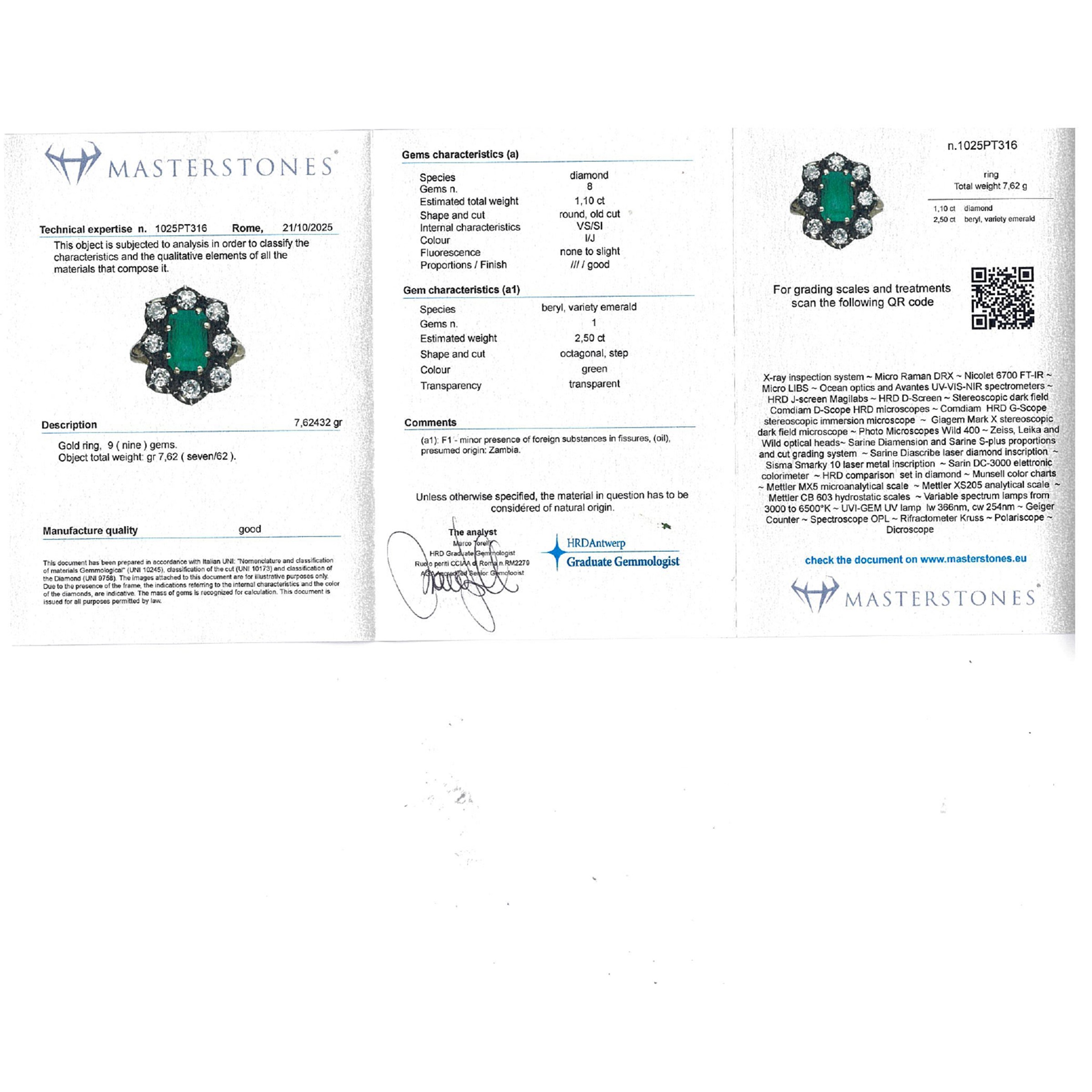octagonal stepped cut circa 2.50 ct, surrounded by old cut diamonds circa 1.10 ct, I/J color - VS/SI clarity, size 15