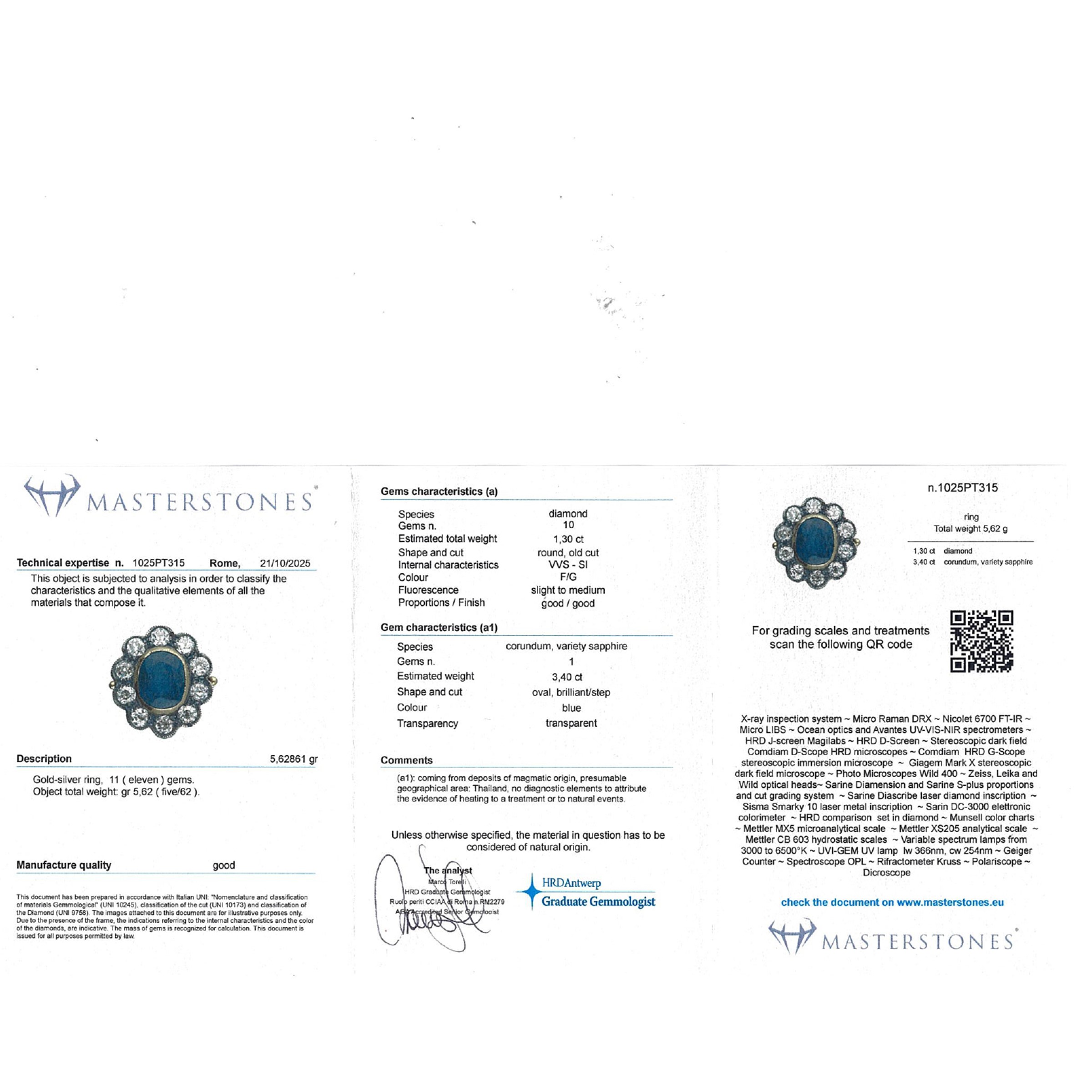 weight 6 gr.faceted oval cut of approximately 3.40 ct, without heat treatment, surrounded by old cut diamonds of approximately 1.30 ct, F/G color - VVS/SI clarity, size 9.5, complete with gemological certificate