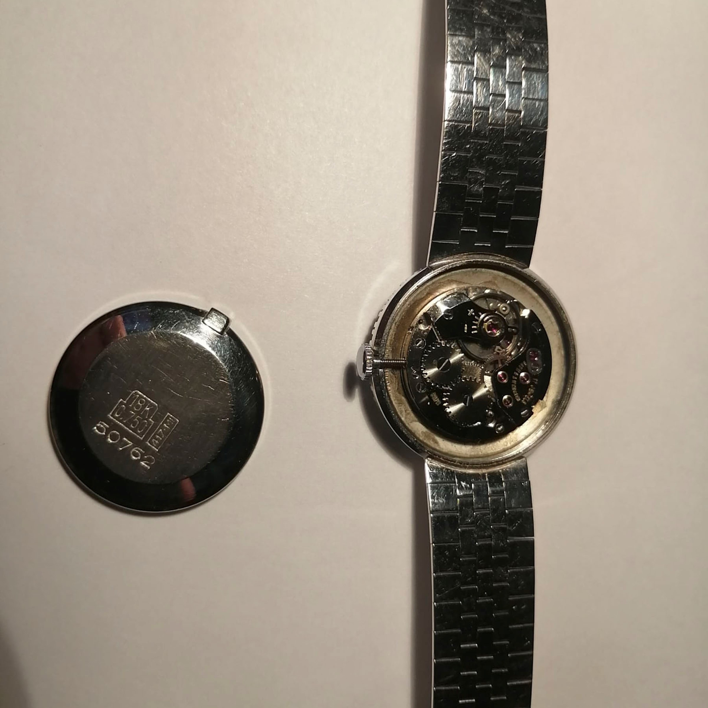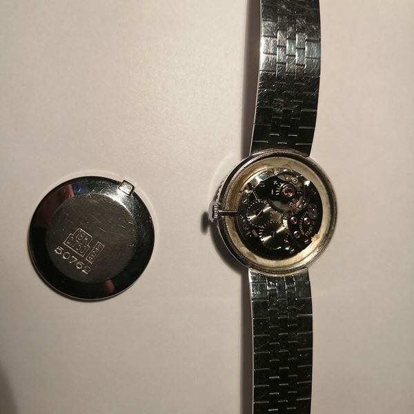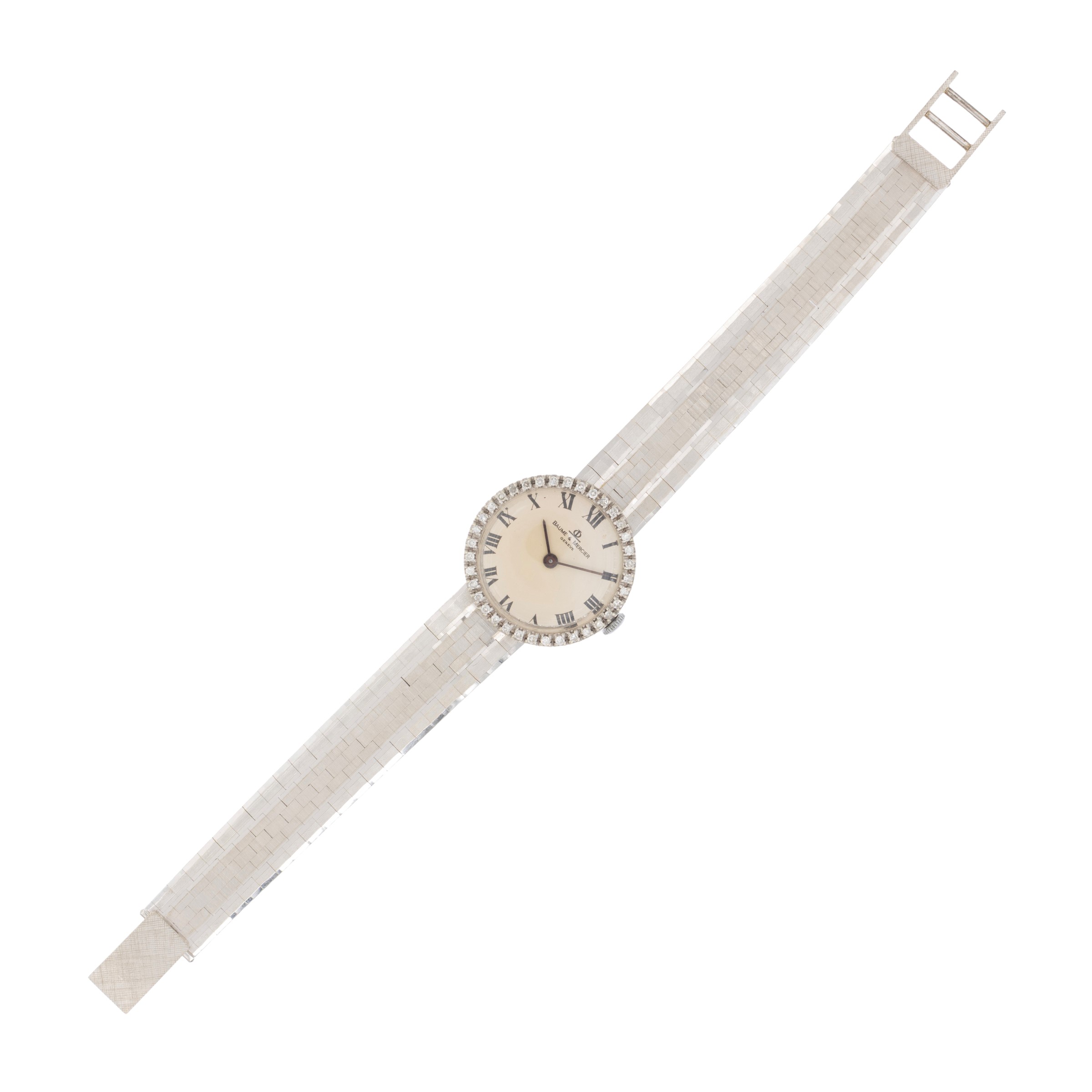 in 18kt white gold, ref. 50762, 24 mm case. with brilliant-cut diamonds, white dial with Roman numerals, mechanical movement with manual winding, ETA 2512 caliber, 18kt white gold bracelet, adjustable length 17.5 cm., signed case, dial and movement