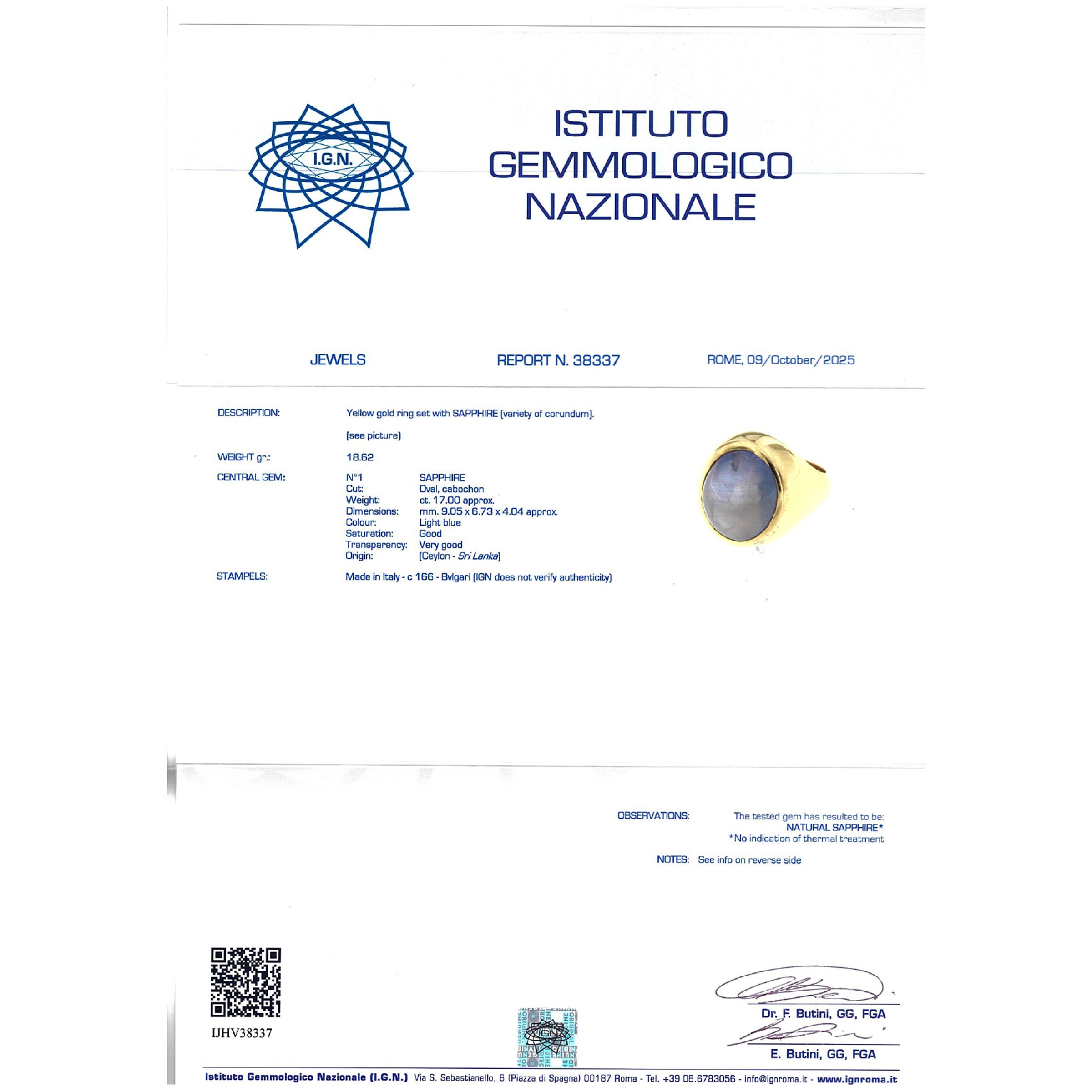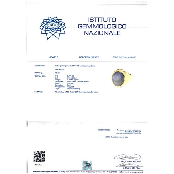cabochon cut sapphire circa 17 ct, without heat treatment, complete with gemological certificate, size 14.5
