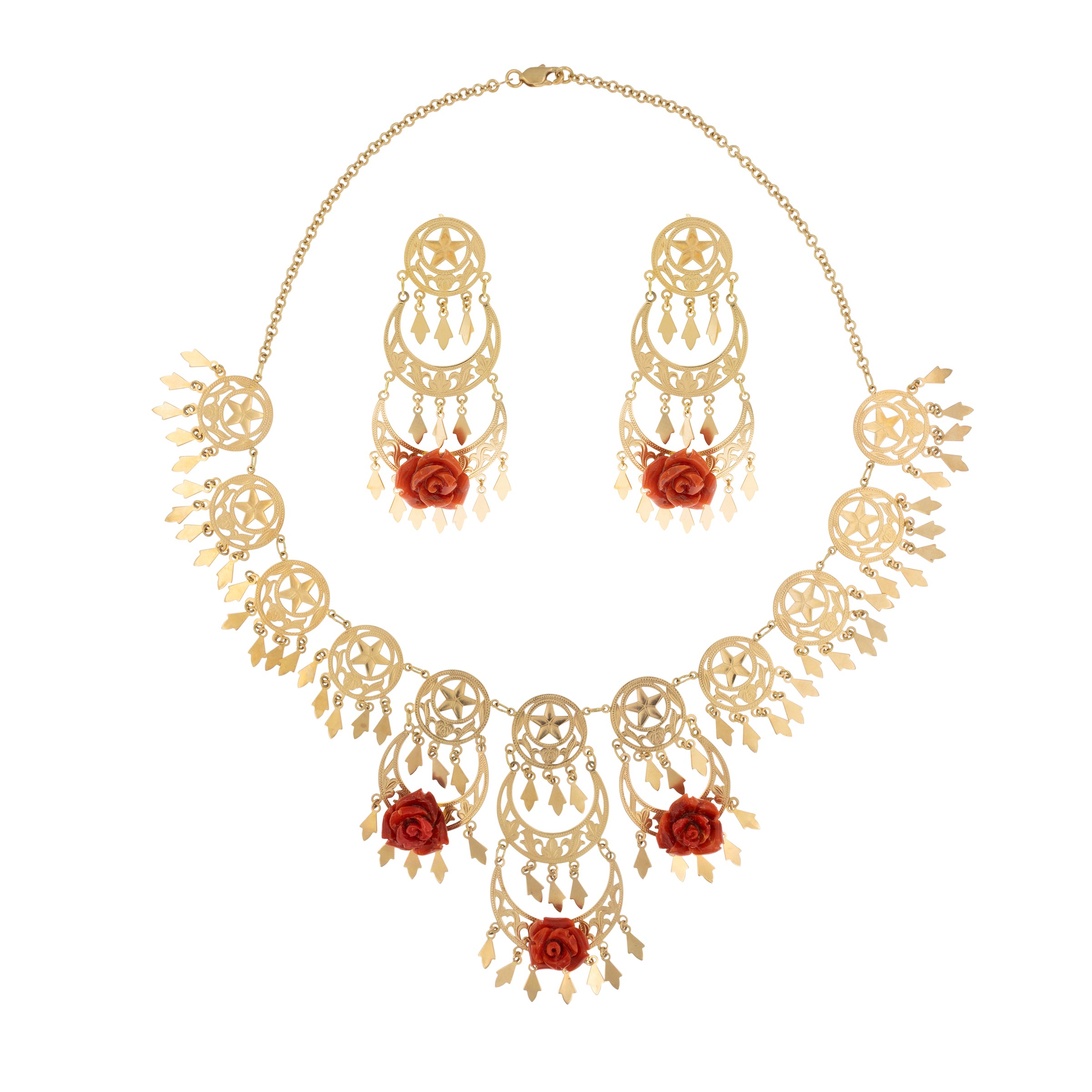 weight 48 gr.in 18kt yellow gold and coral roses, necklace length 43 cm.