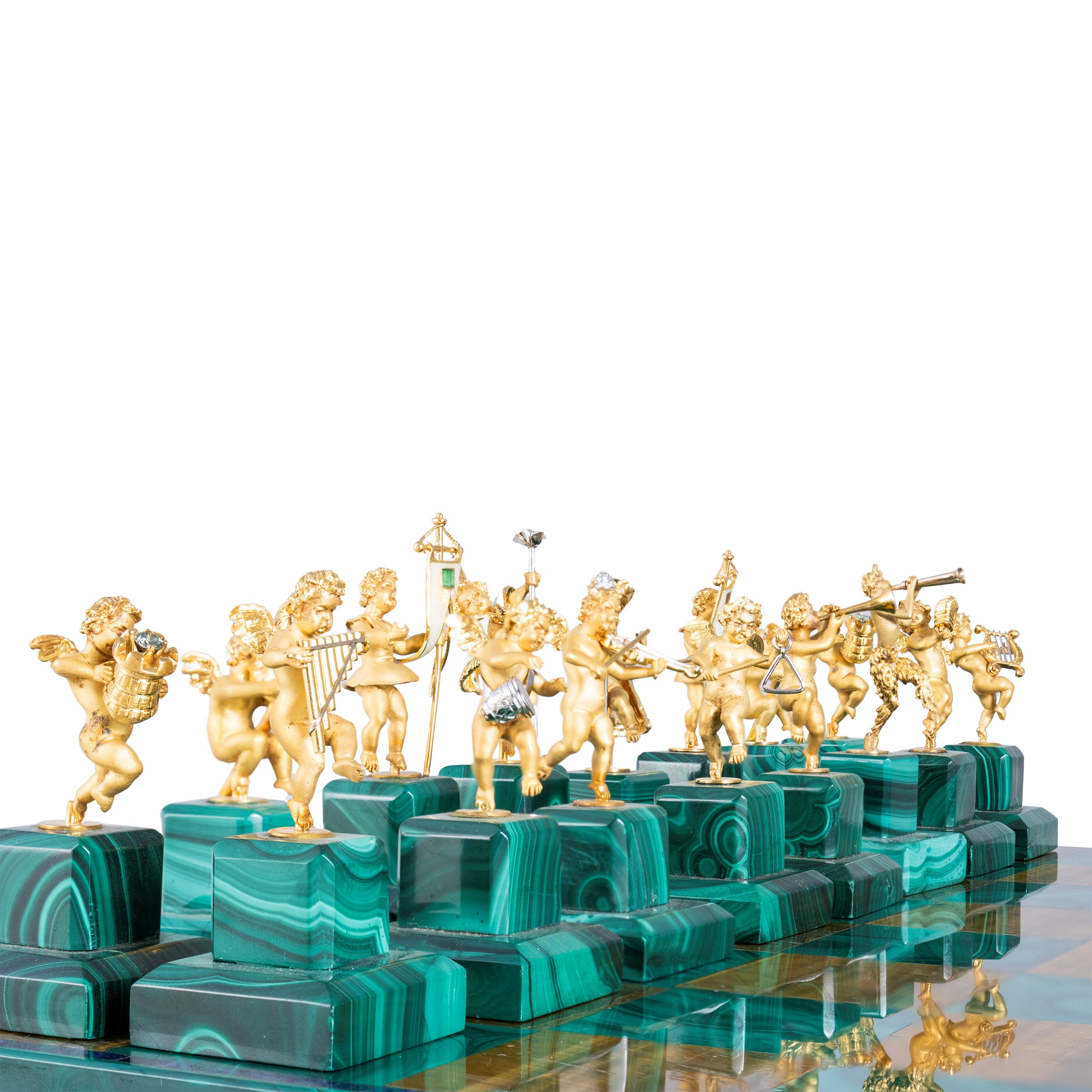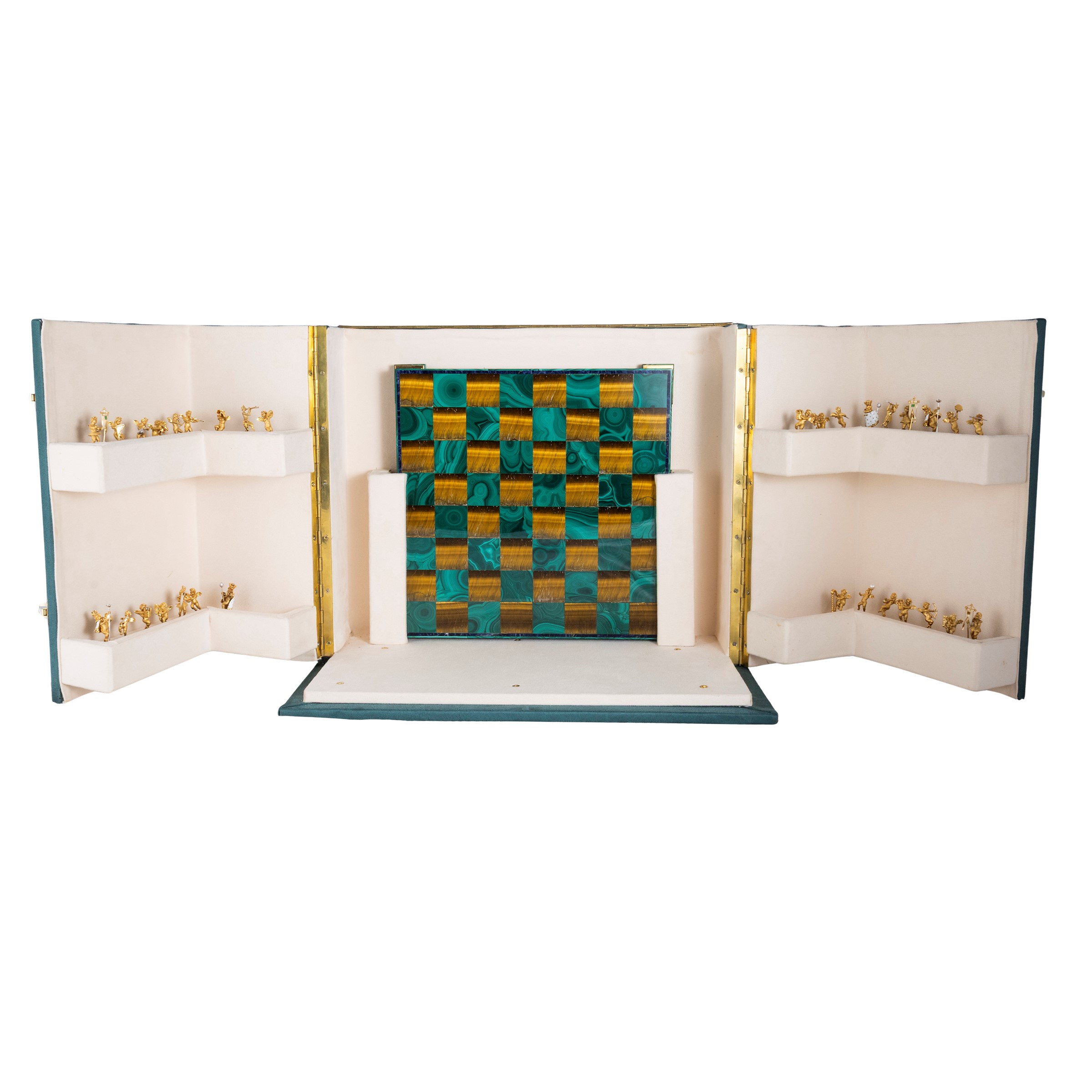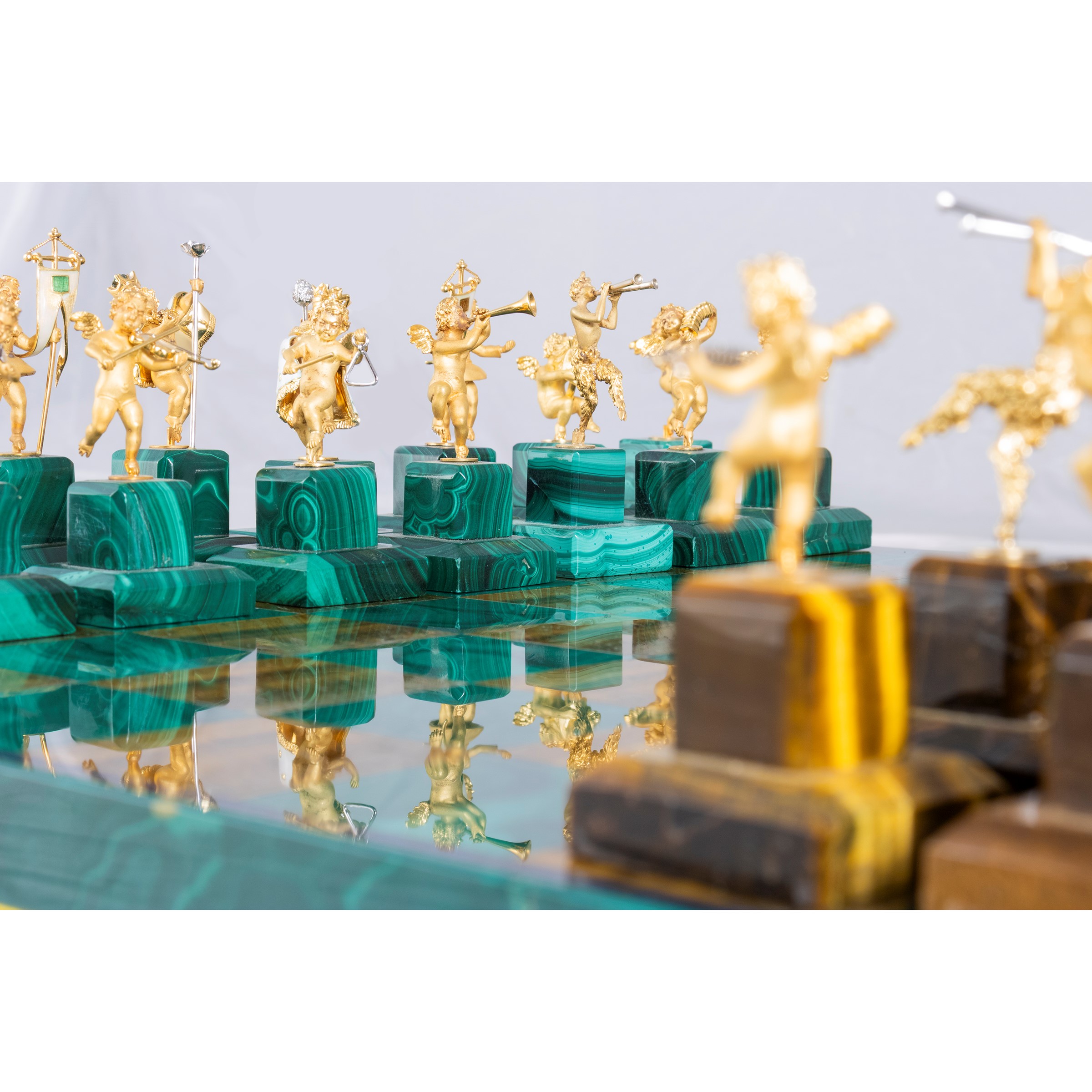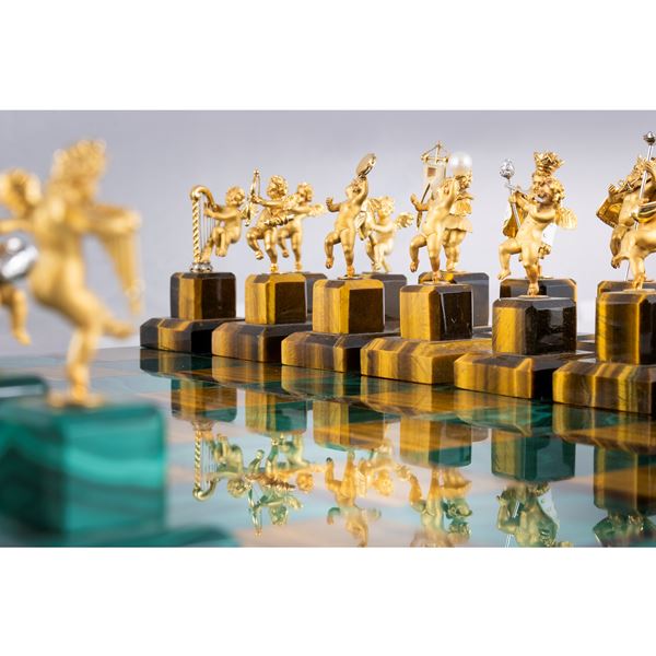 Important chessboard in 18kt yellow gold malachite and tiger's eye