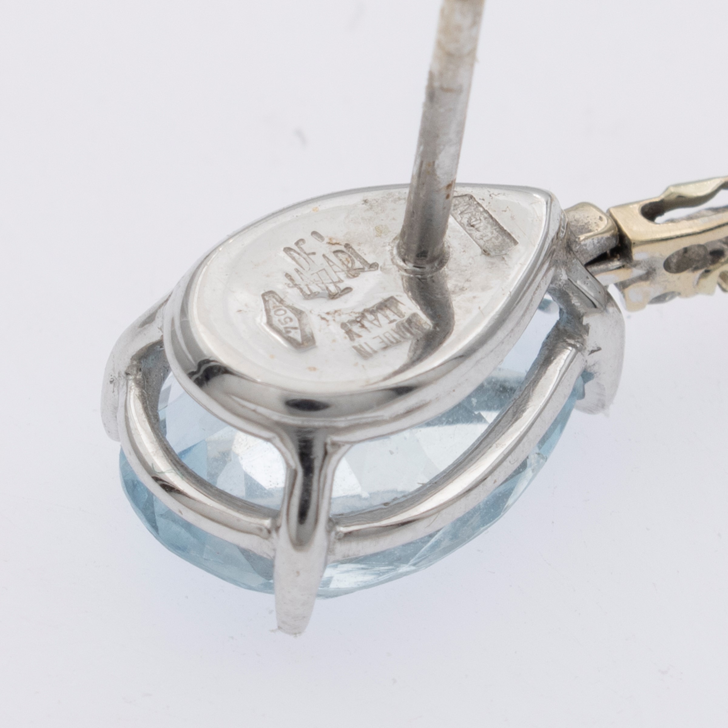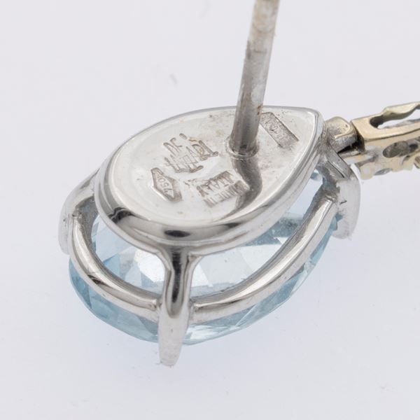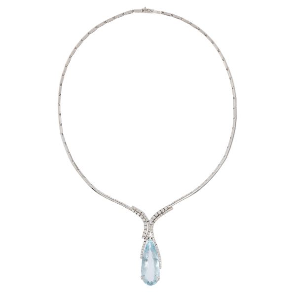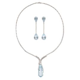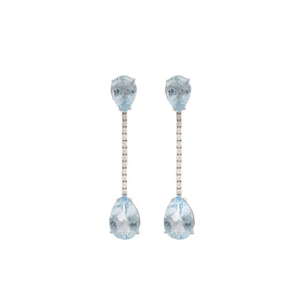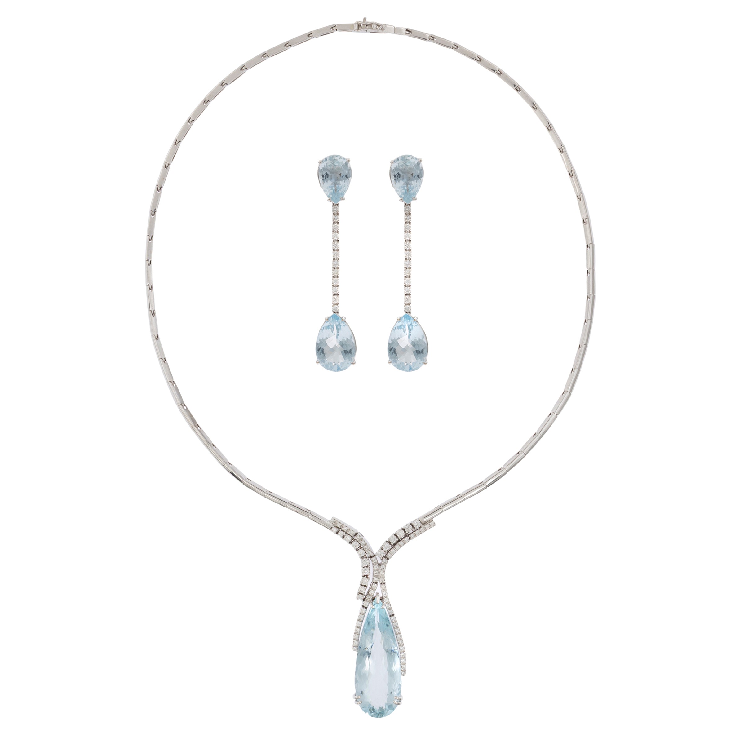 in 18kt white gold, natural pear-cut aquamarines and brilliant-cut diamonds circa 1.70 ct, necklace length 45 cm. - earrings 5.3 cm.