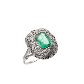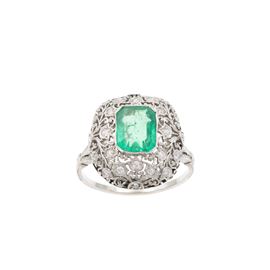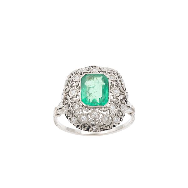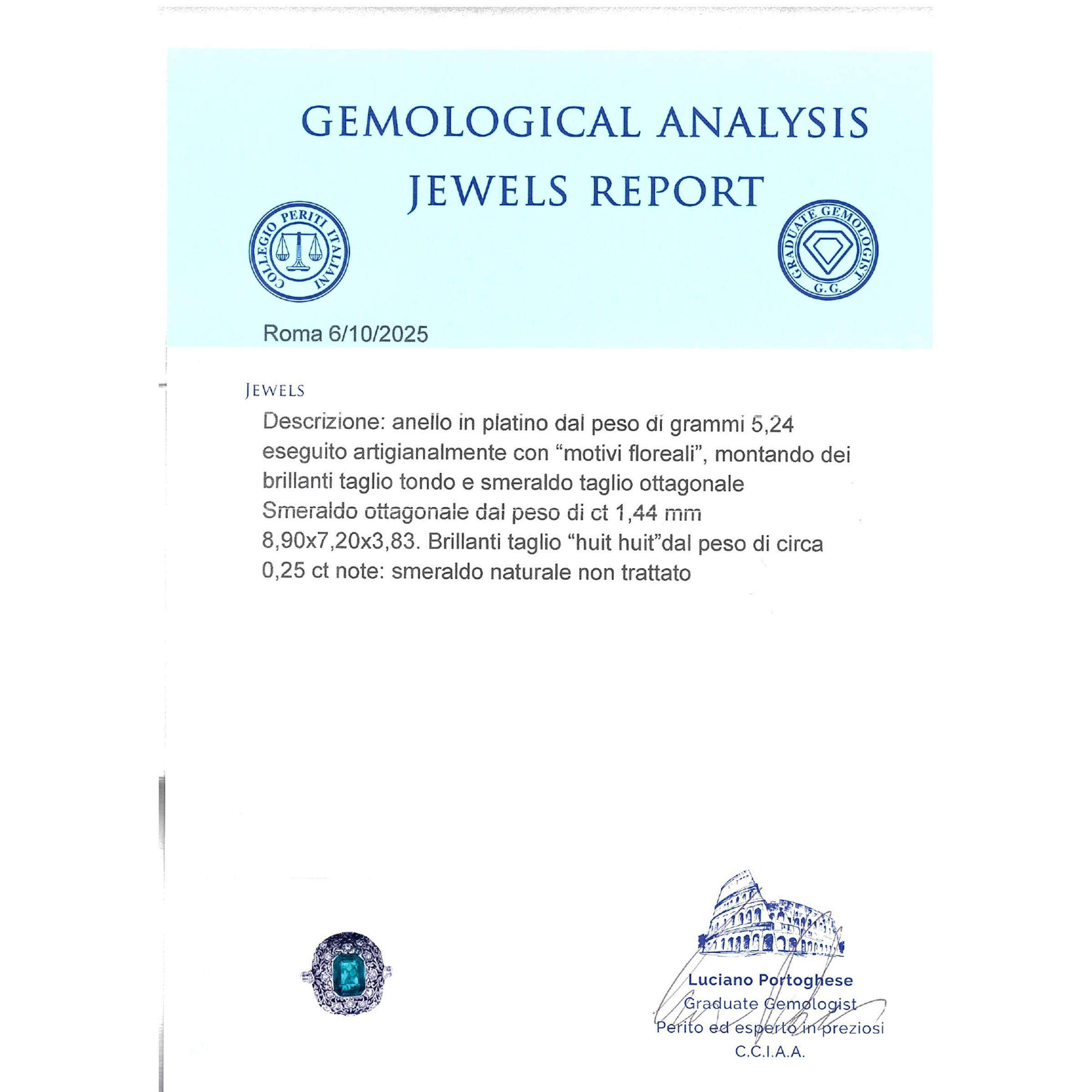 weight 5 gr.octagonal stepped cut emerald circa 1.44 ct, huit-huit cut diamonds circa 0.25 ct, size 16.5, complete with gemological certificate