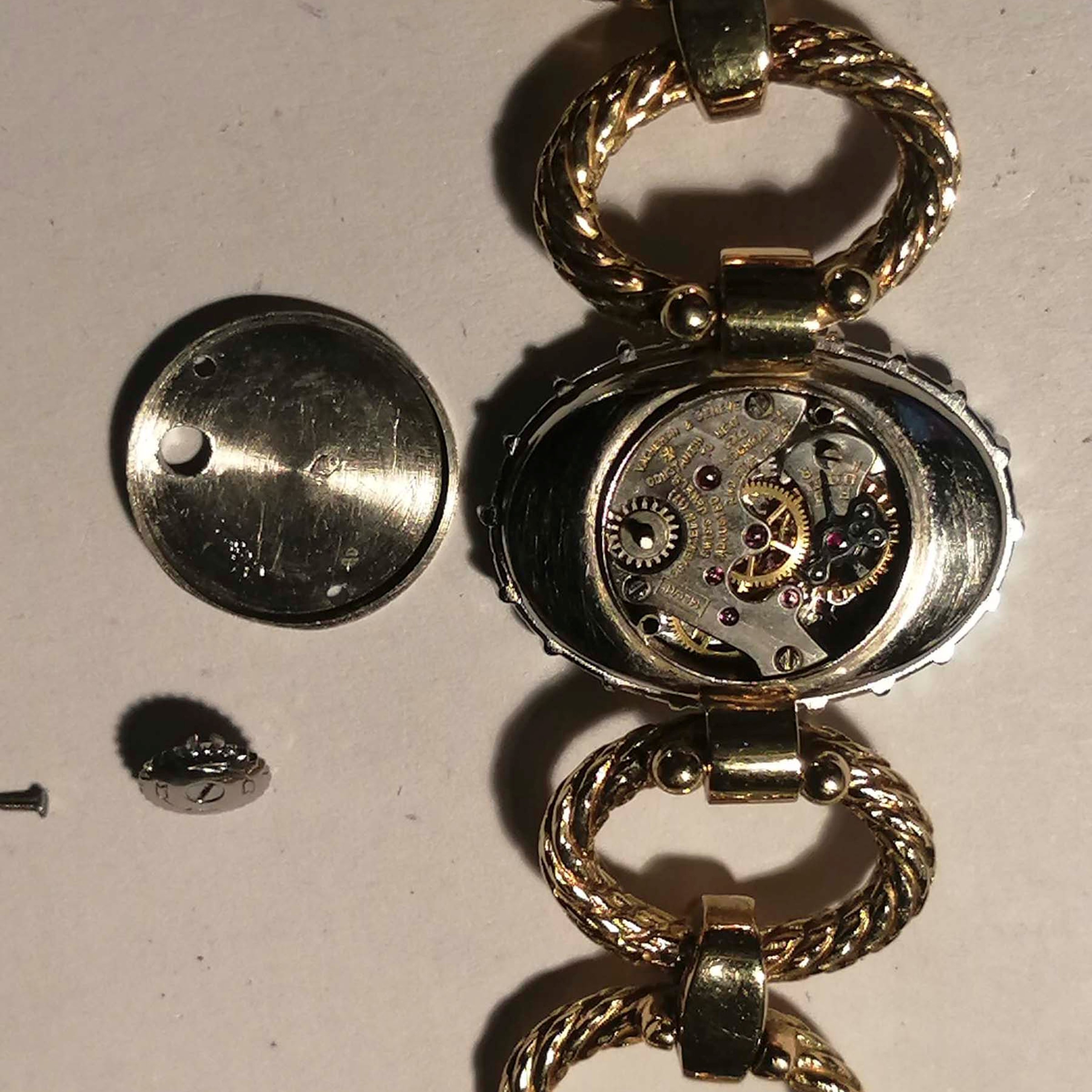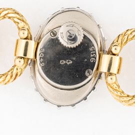 18kt white gold case, ref. 5042 - 9315, bezel with brilliant-cut diamonds circa 0.80 ct, champagne dial with indexes, winding crown under the case, mechanical movement with manual winding, V.C. caliber 142c/gb, original 18kt yellow gold bracelet, signed case, dial and movement