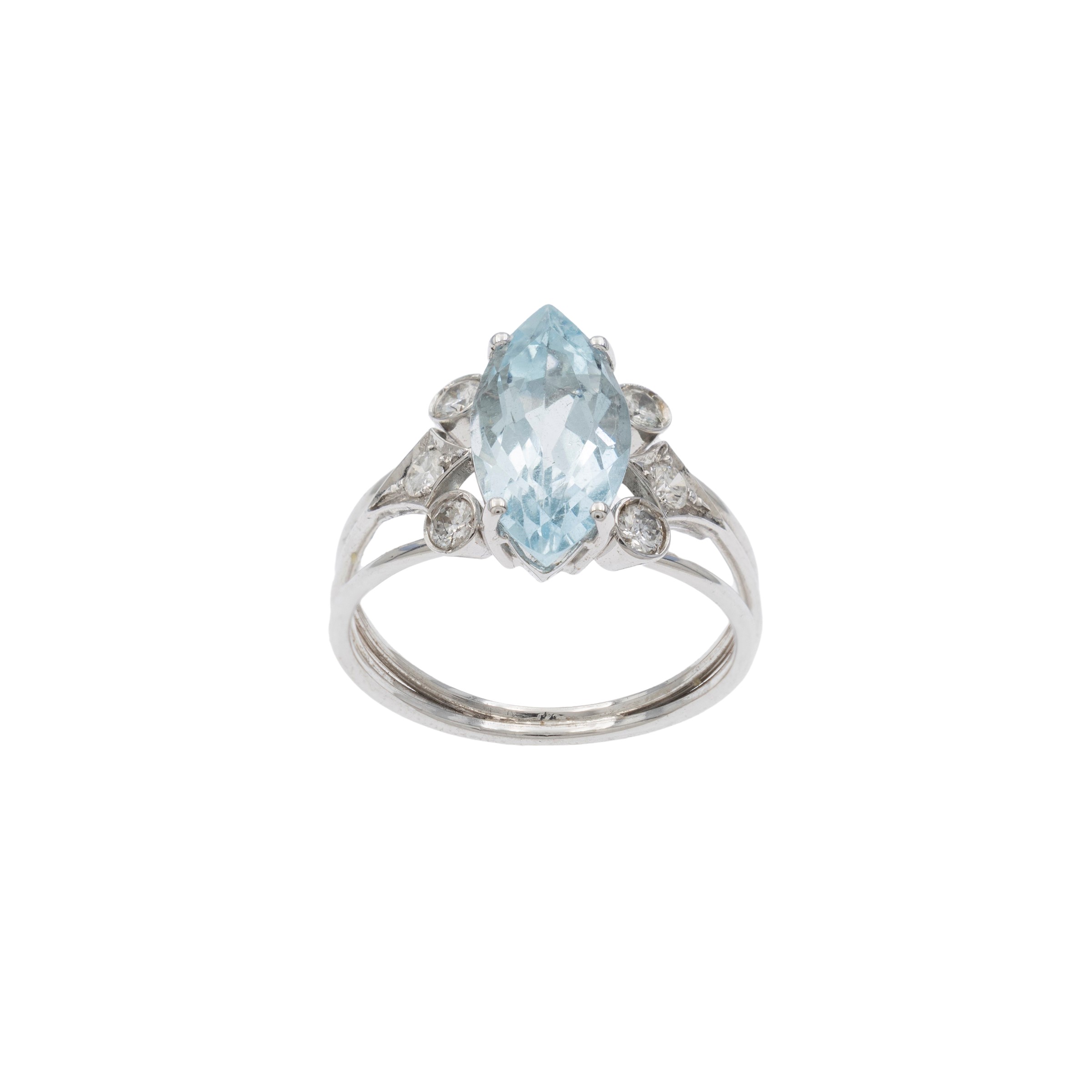weight 4 gr.marquise cut aquamarine circa 2,80 ct, brilliant cut diamonds circa 0,30 ct, size 15