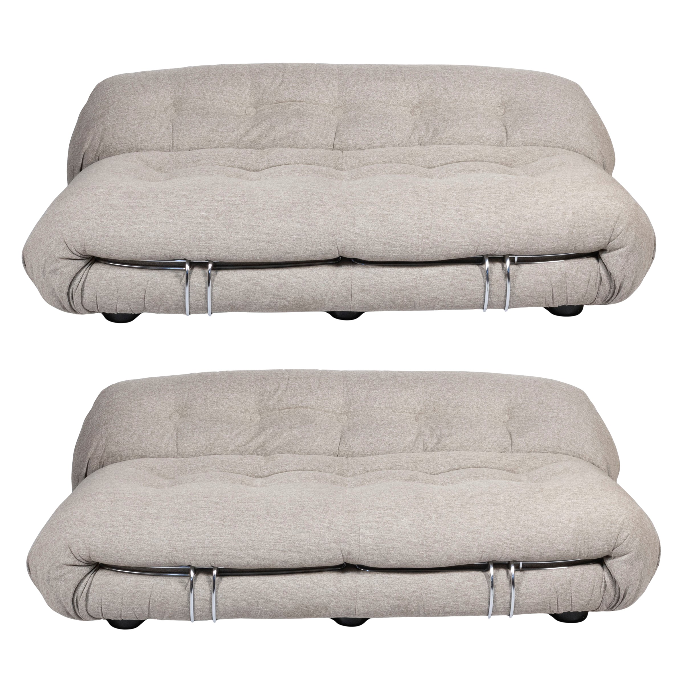 60x170x100 cm.pair of Soriana mod. sofas in padded fabric and chromed metal, slight wears and non-coeval components.