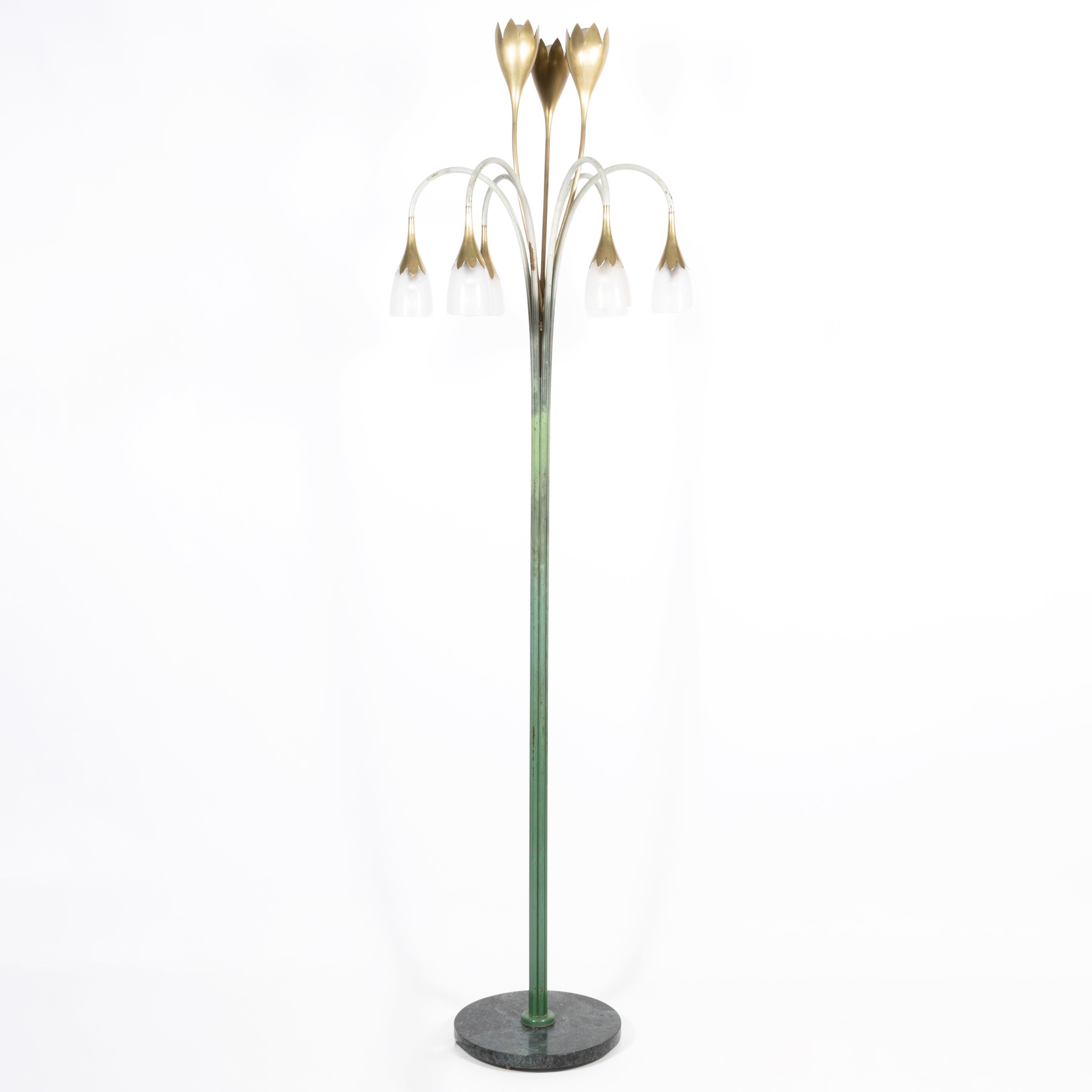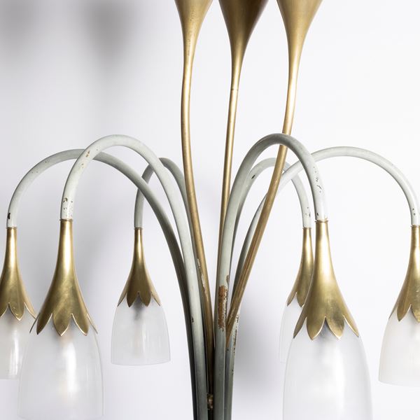 Calla mod. floor lamp in painted metal, brass, satin glass and marble base, certificate of authenticity, wears and slight defects on the base Literature: Arredoluce: Catalogo Ragionato 1943-1987, Milan, 2018, pag. 153