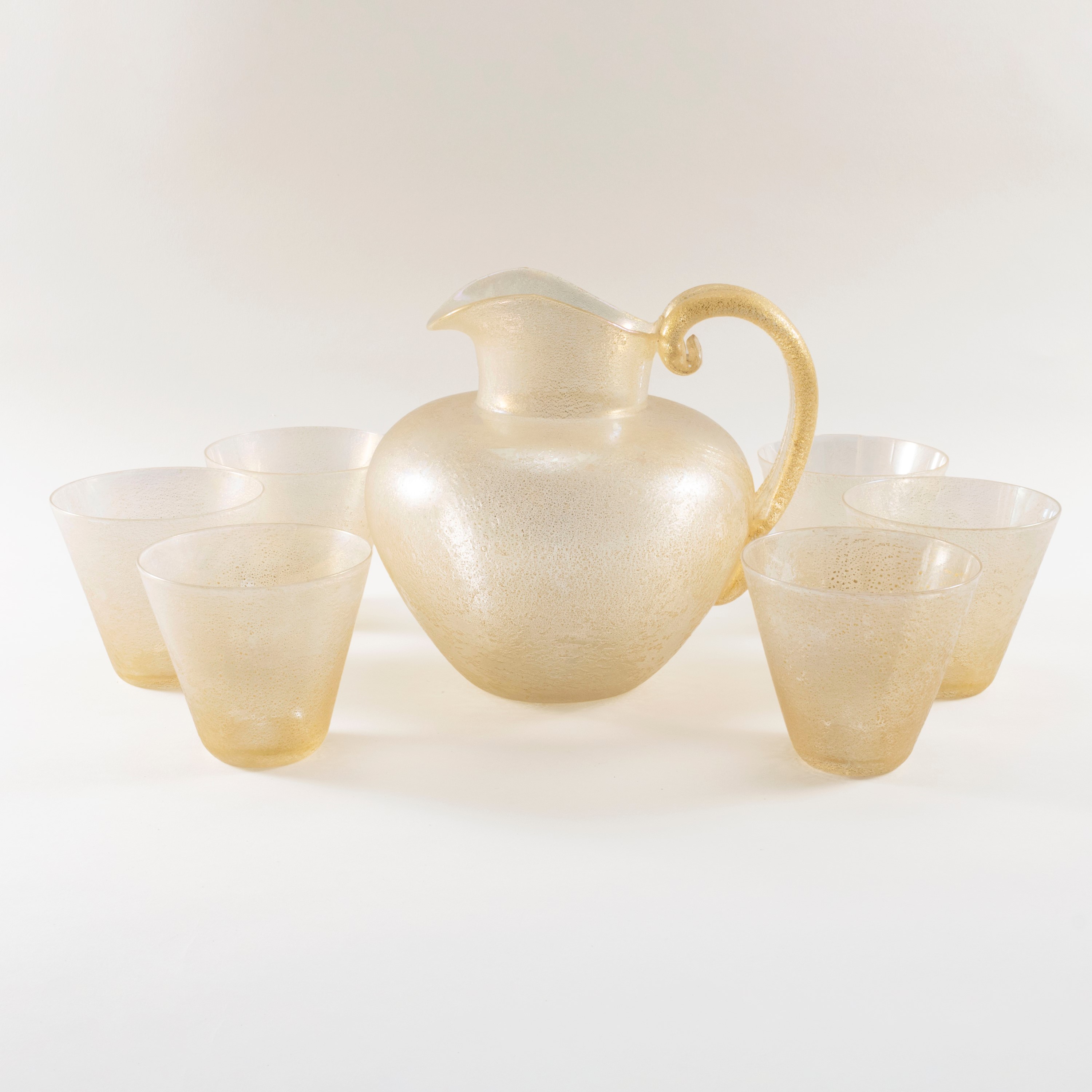 glass and gold leaf service Murano, slight defect. comprising: a jug 20x22x18 cm. 6 glasses 9.5x10.5 cm.