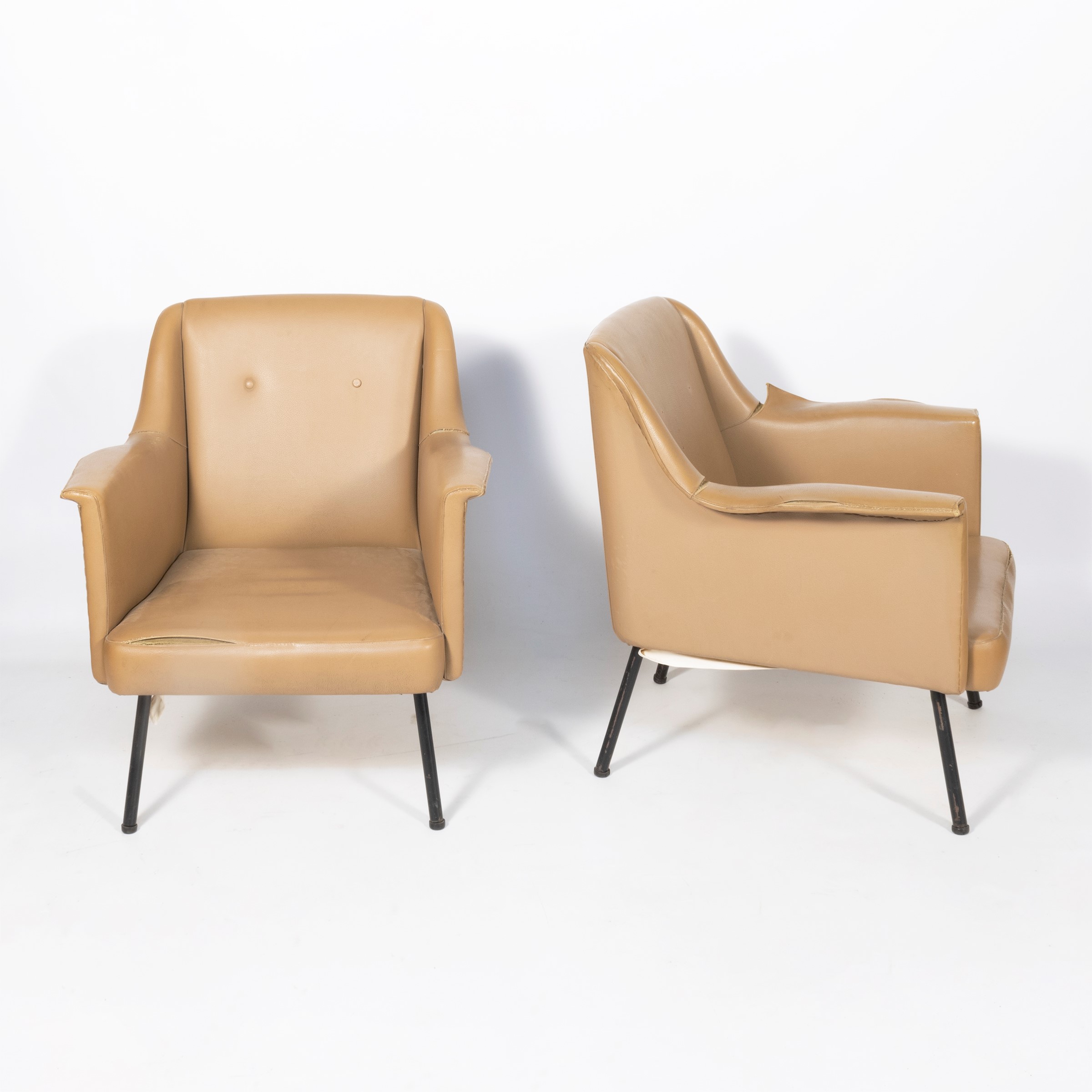 73x55x60 cm.Pair of armchairs in padded leather and painted metal, one bears production label, wears and defects.