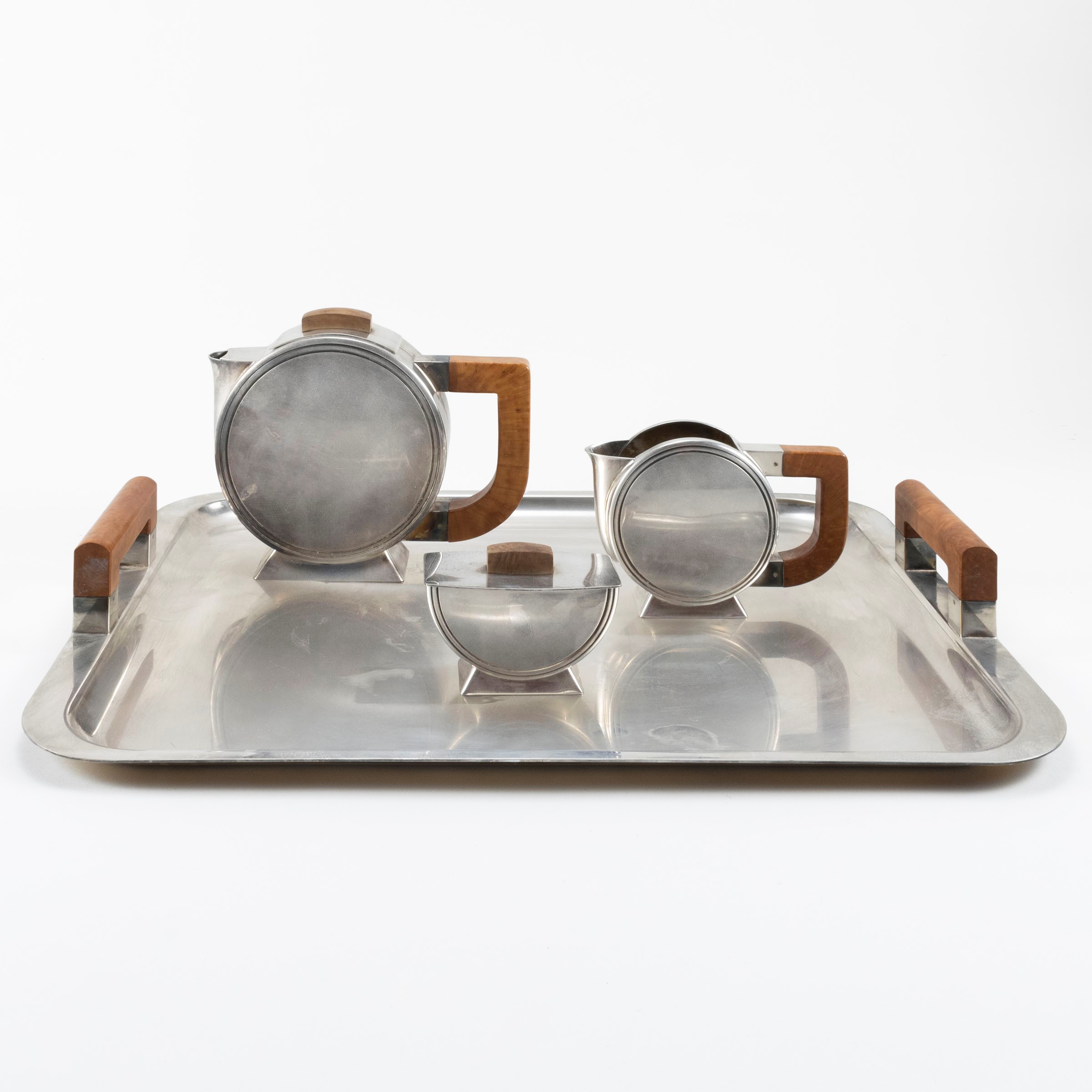 Tea service in silver plated and wood, production mark, slight wears. Comprising: