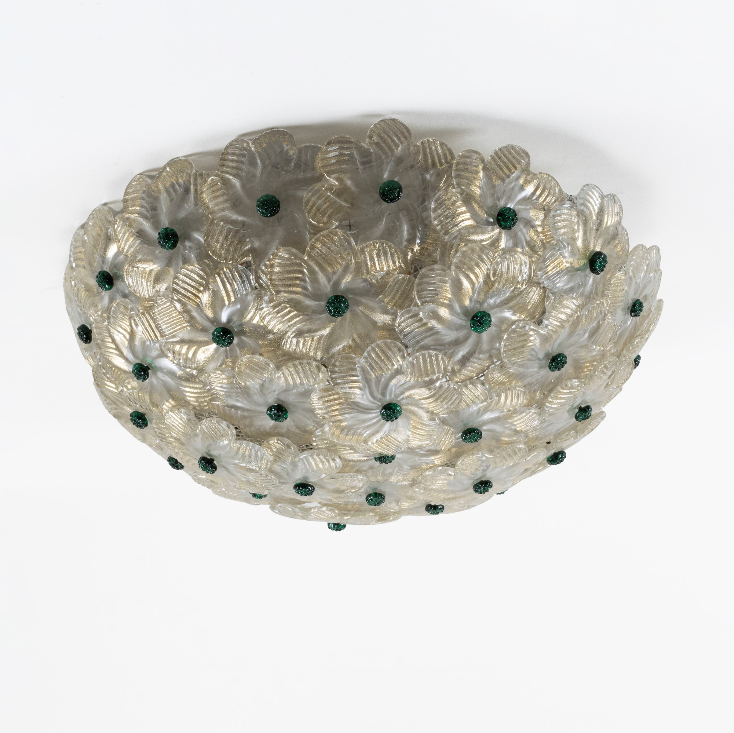 d. 33 cm.ceiling lamp in painted metal, brass and transparent and colored blown glass flowers, slight defects