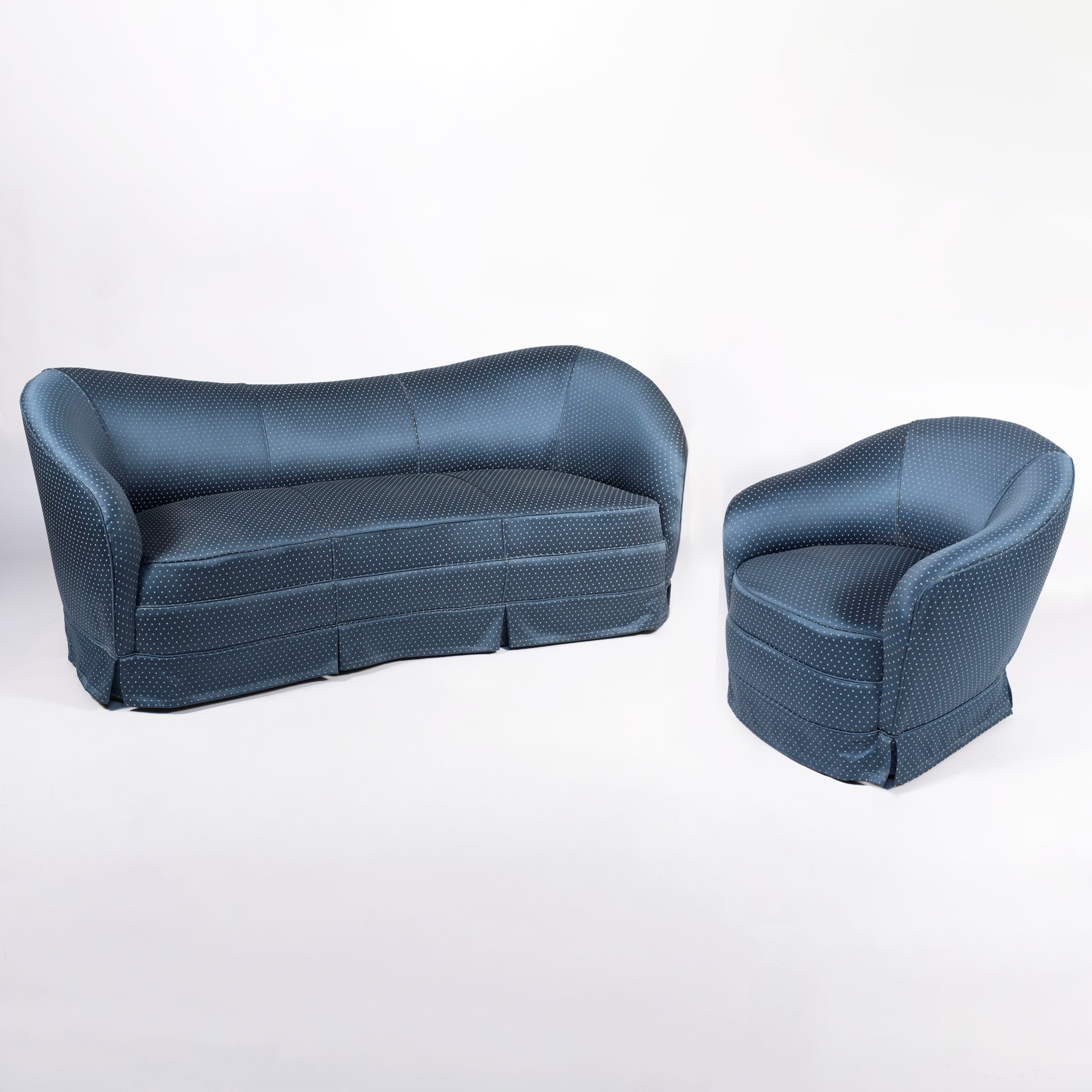 upholstered fabric lounge, slight wears. Comprising: a sofa 74x188x75 cm. an armchair 74x80x70 cm.