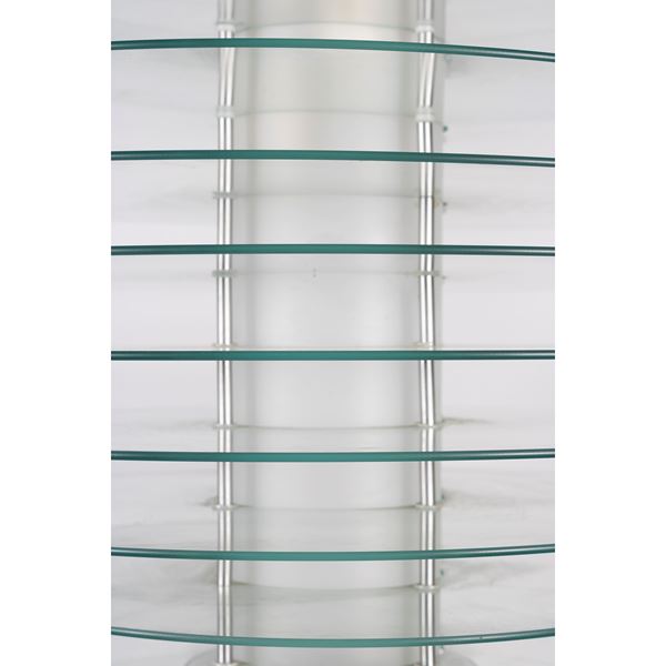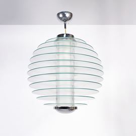 0024 mod. suspension lamp in chromed metal, sandblasted glass and transparent glass, slight wears Literature: C e P. Fiell, 1000 Lights, Taschen, 2013, pag. 200