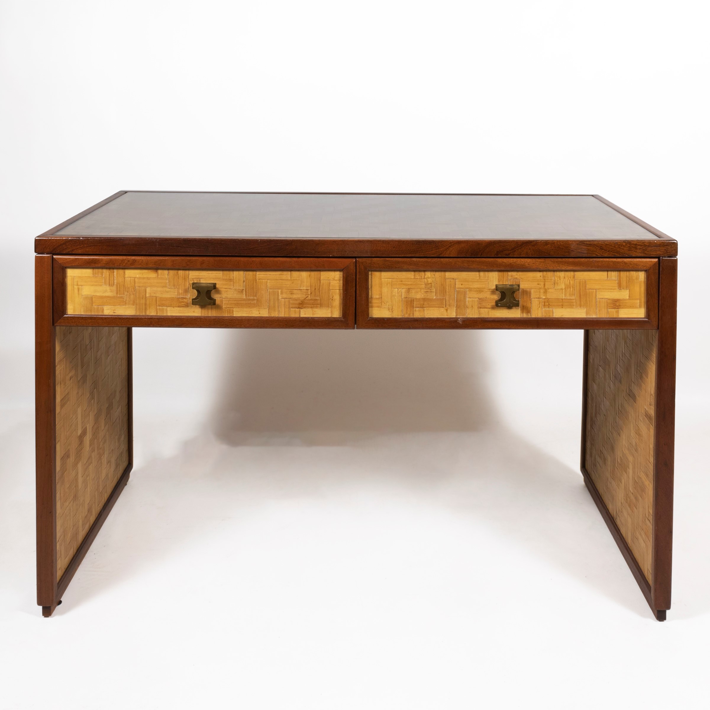 80x125x63 cm.desk in wood, brass and transparent glass, 1970s, slight wears