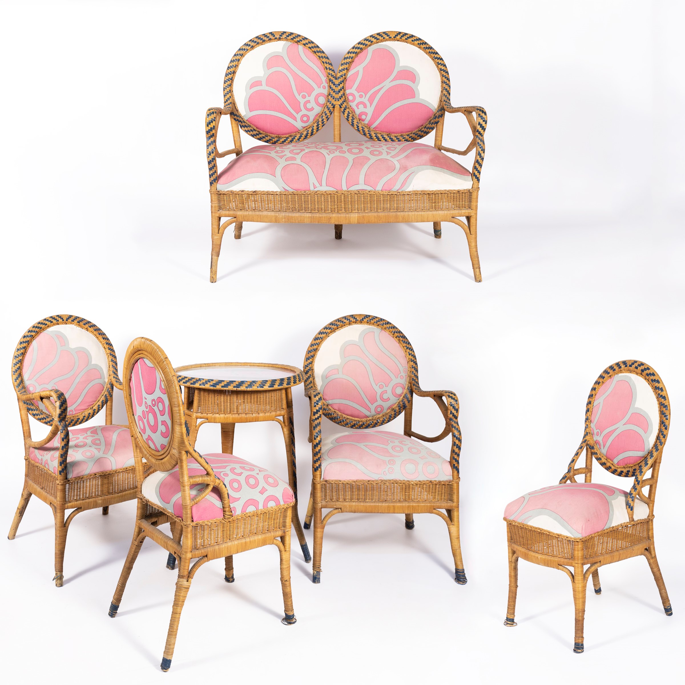 living room in wicker and padded fabric, wear.s, comprising: a sofa 100x112x56 cm. two armchairs 100x58x60 cm. two chairs 98x44x50 cm. a coffee table 78x60 cm.