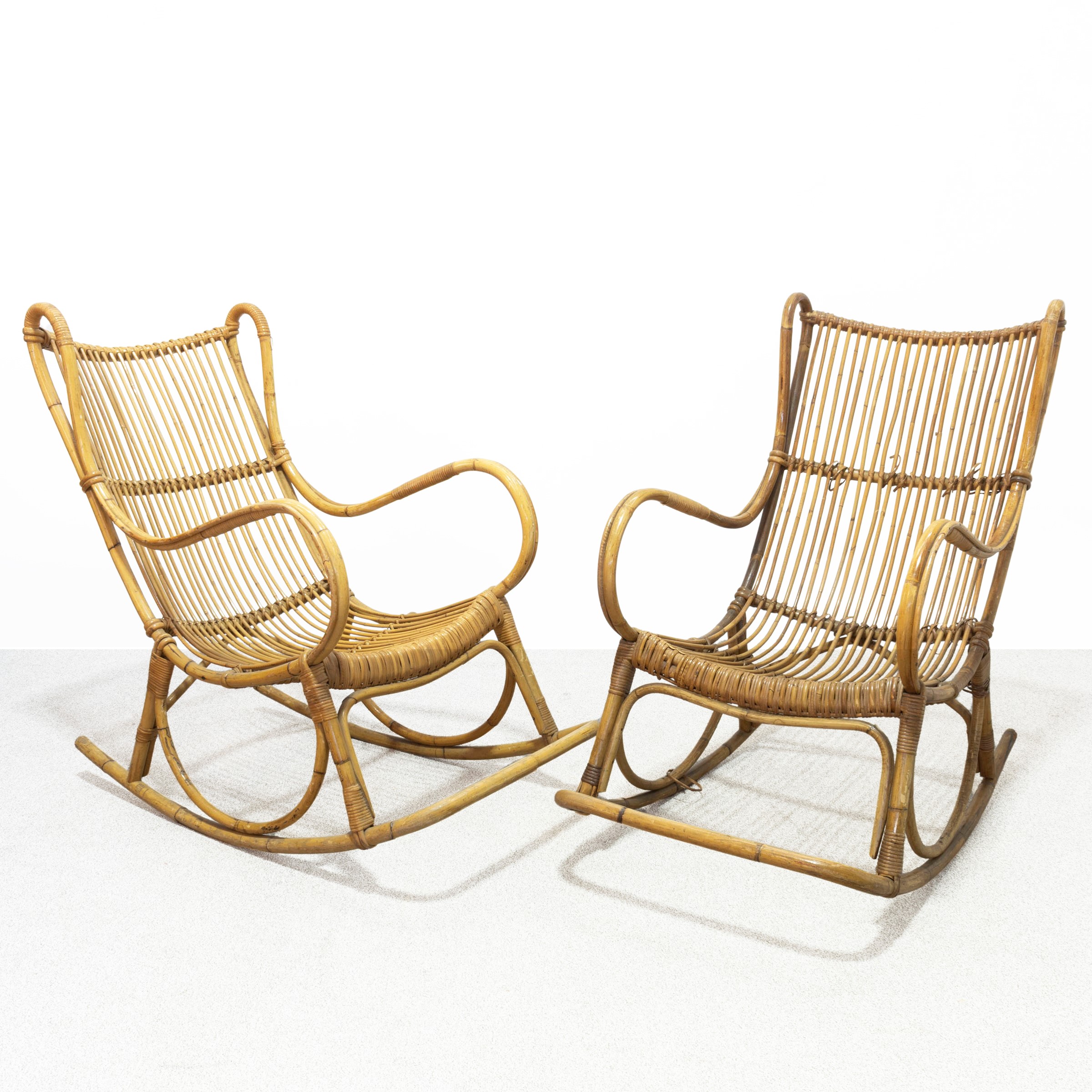 Pair of bamboo rocking armchairs, wears and slight defects