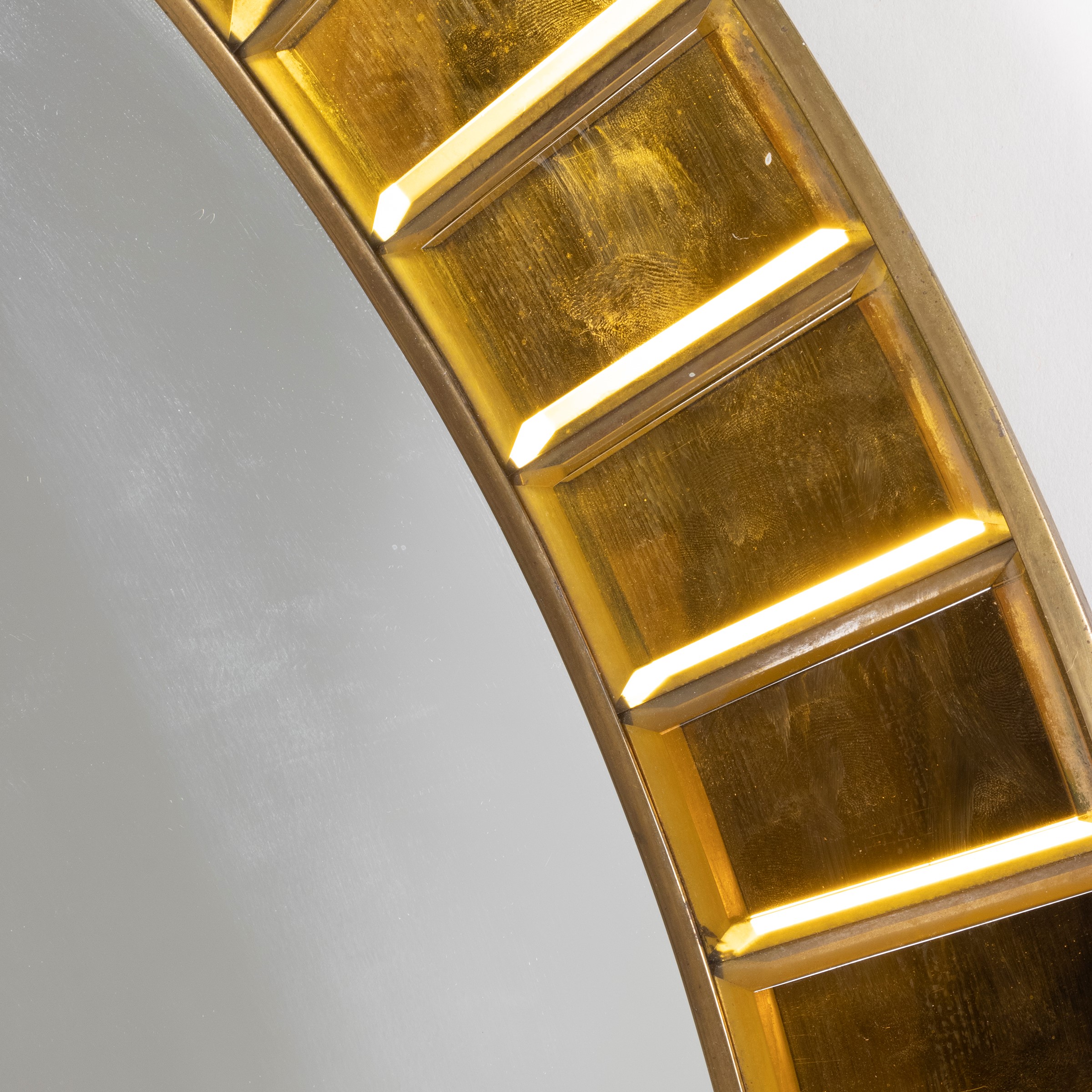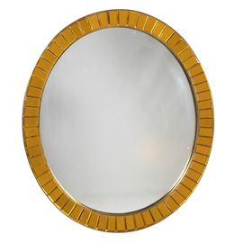 1608 mod. wall mirror in mirrored glass, colored glass, wood and brass, production label, slight wears Literature: Domus 315 (febbraio 1956), pag. 59 Quaderno Fontana Arte n°2 (1961), p. 26 Edoardo Paoli, L'importanza dello specchio, Fabbrica Pisana Saint-Gobain, volume anni '60 non datato, pag. 20