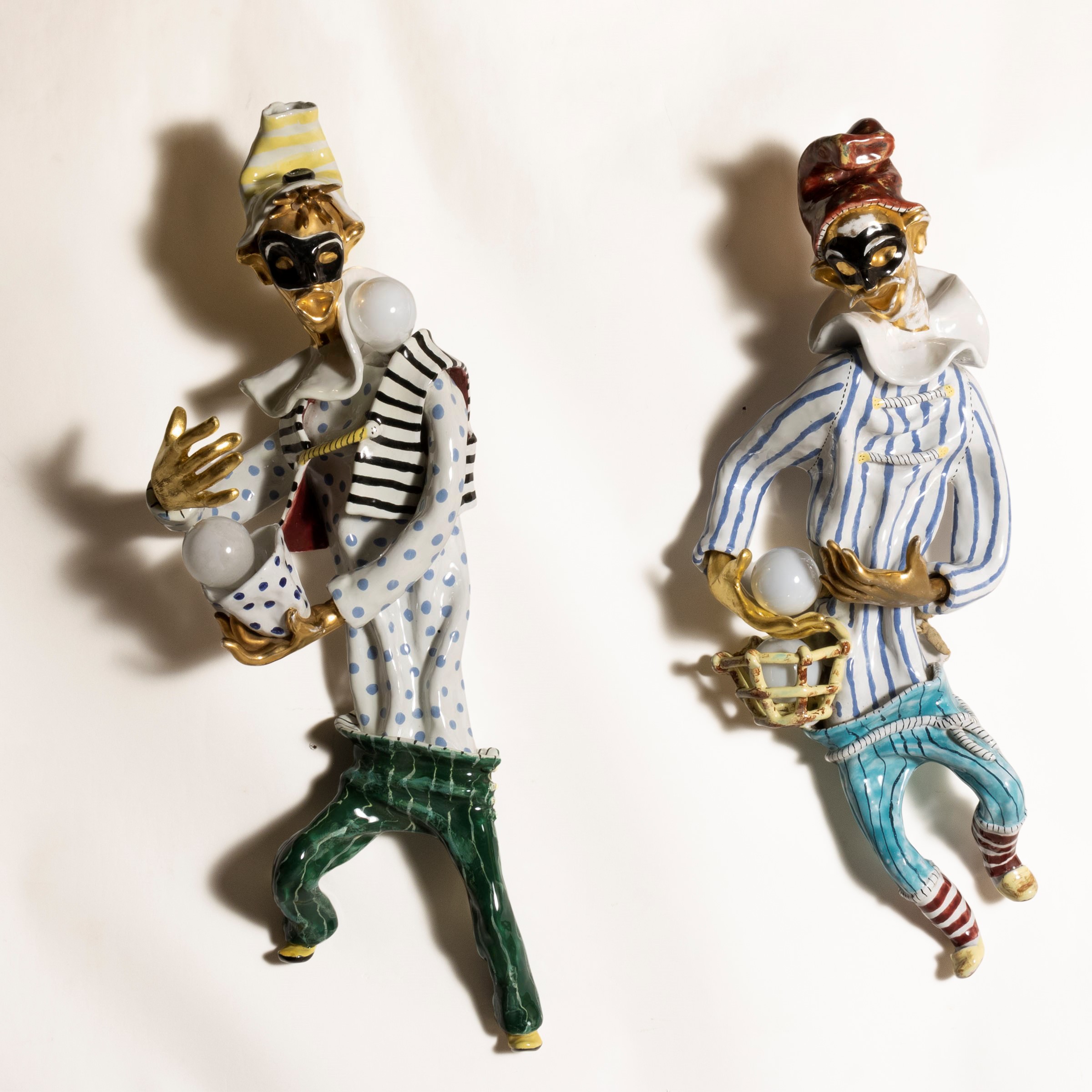 64x23x18 cm.Pair of polychrome ceramic wall lamps, signed, production brand, restorations