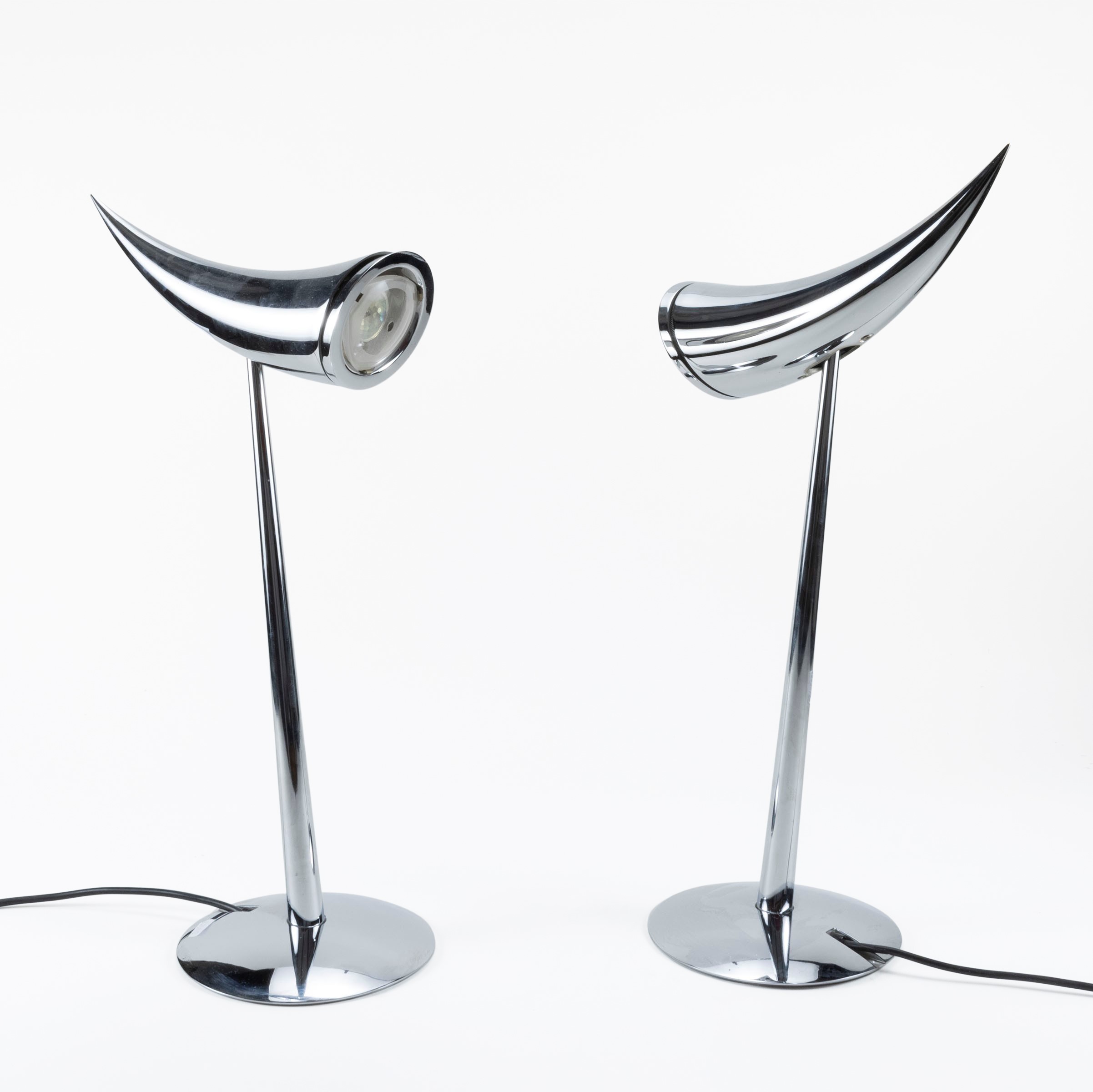 h. 56 cm.pair of Ara mod. table lamps in chromed steel, production label, slight wears