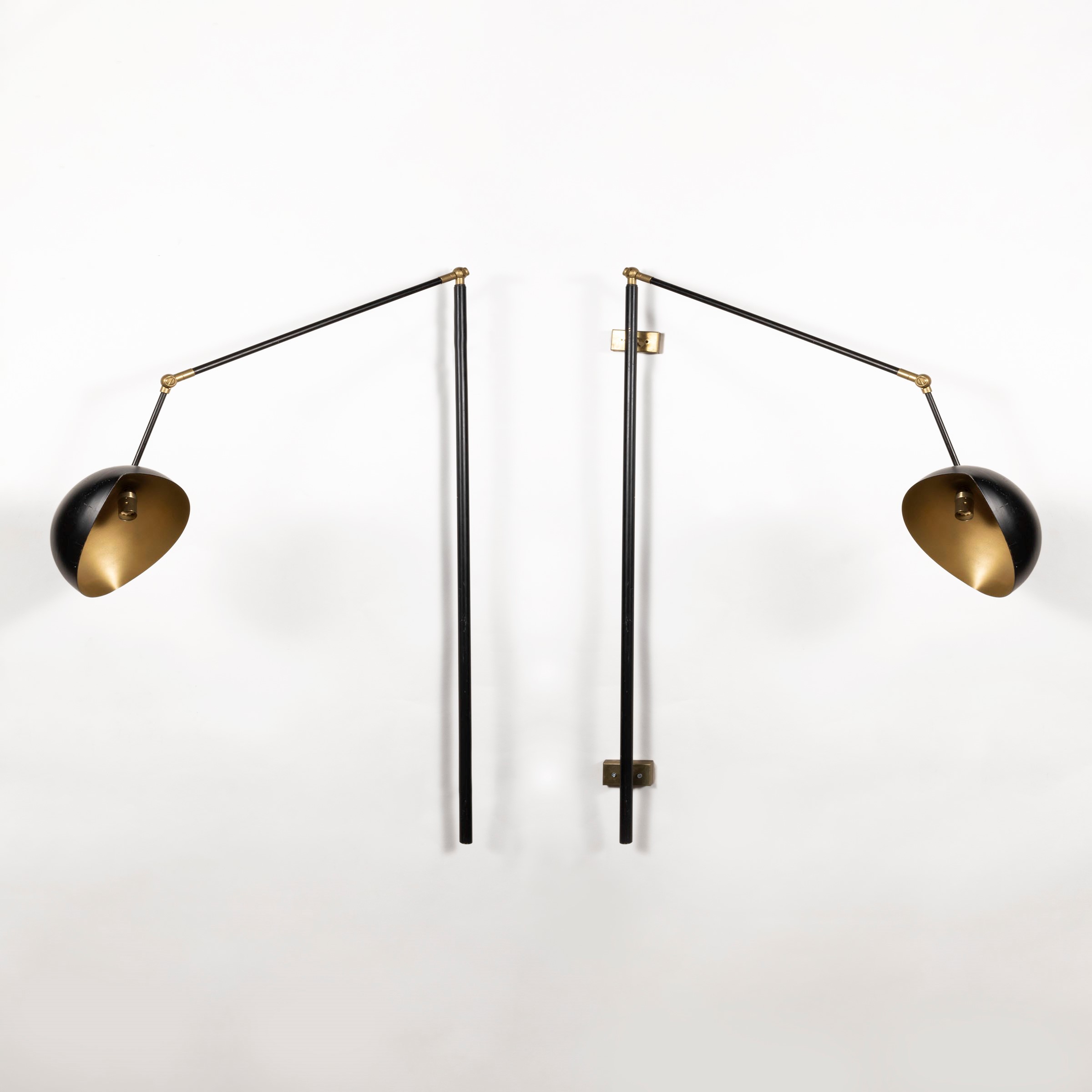 Pair of adjustable wall lamps in painted metal and brass, production label, defects and losses