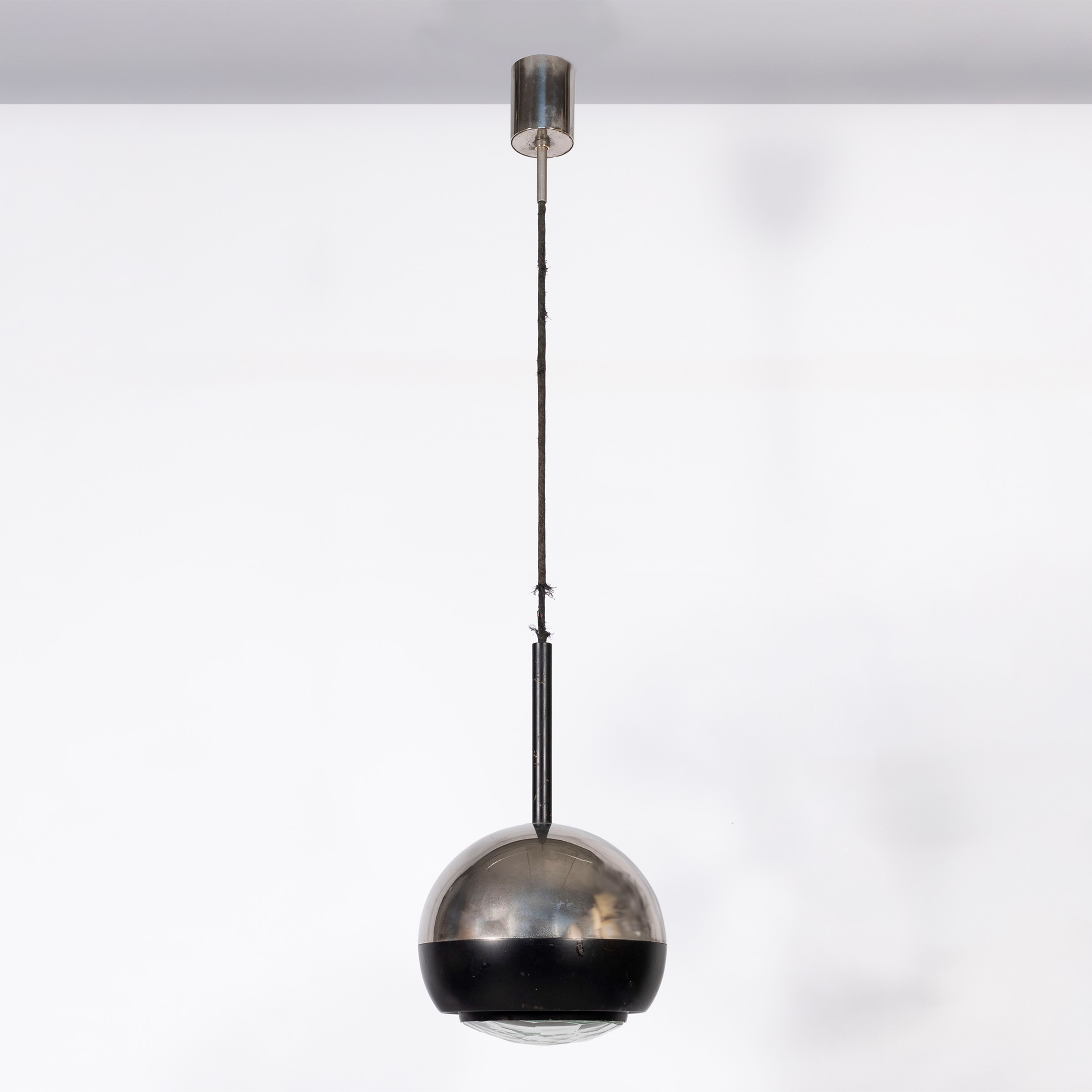 1230 mod. suspension lamp in lacquered metal, chromed metal and transparent glass, production label, wears
