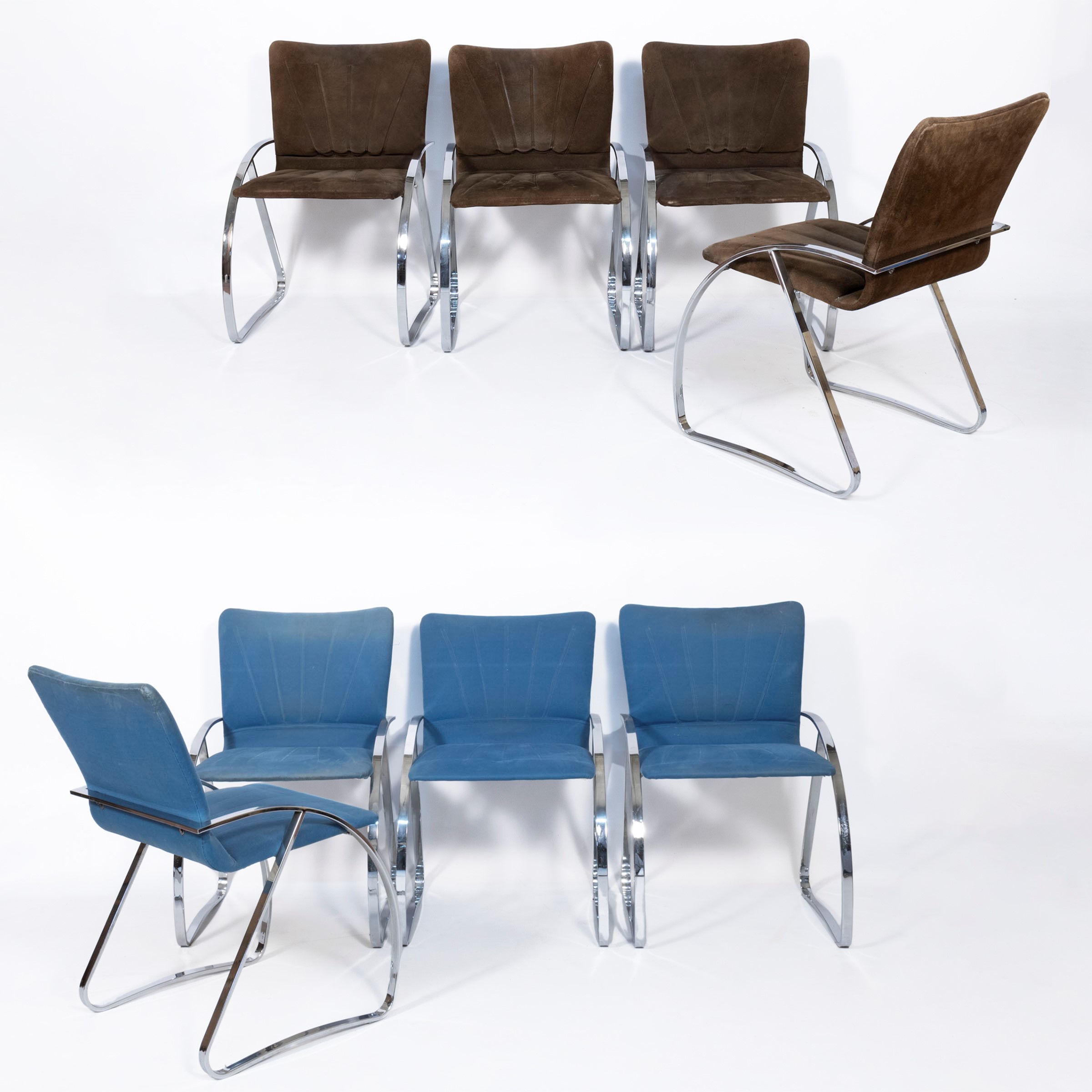 eight chairs in steel and upholstered fabric, slight wears