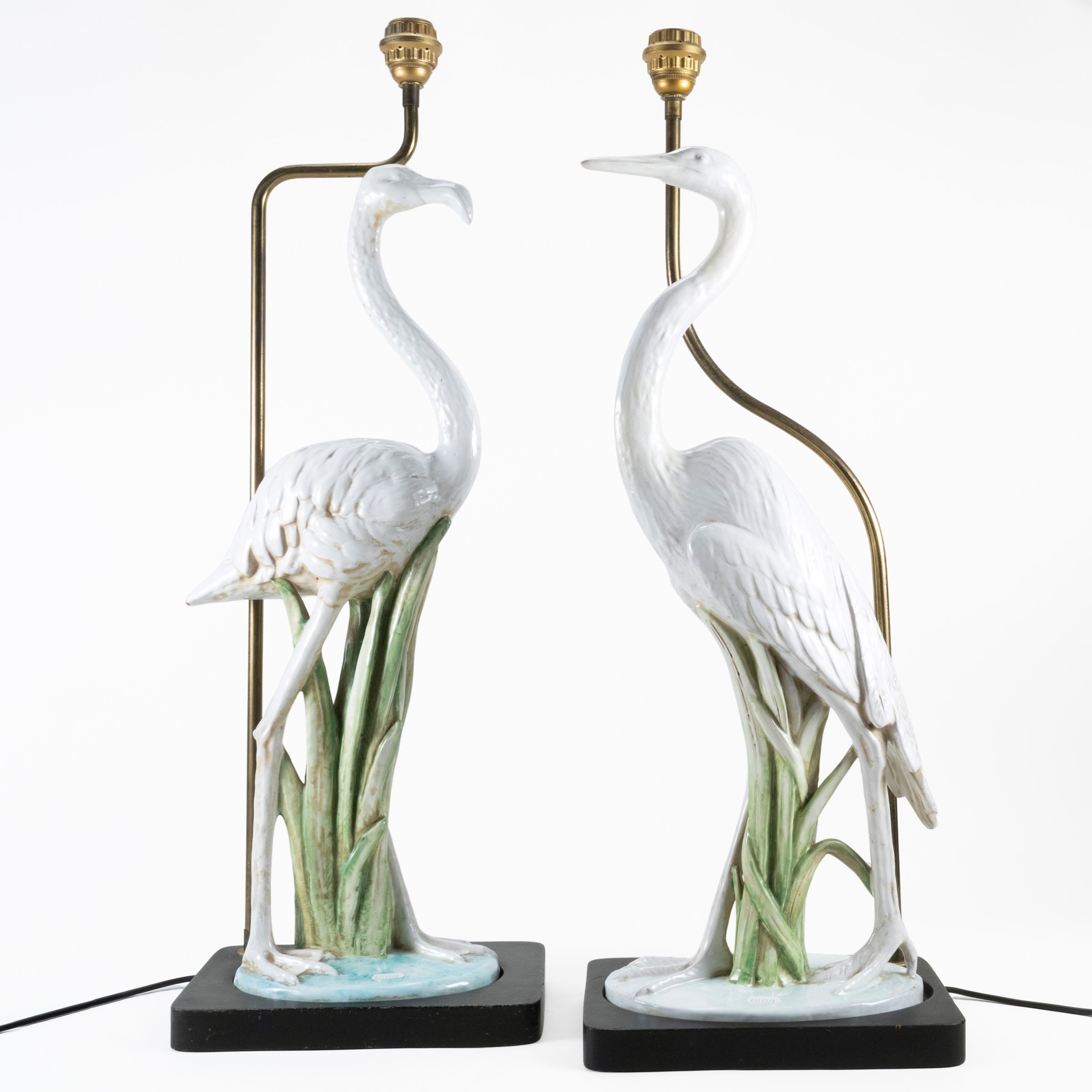 h. maximum 85.5 cm.Pair of table lamps in polychrome ceramic, brass and wooden bases, signed, slight wears