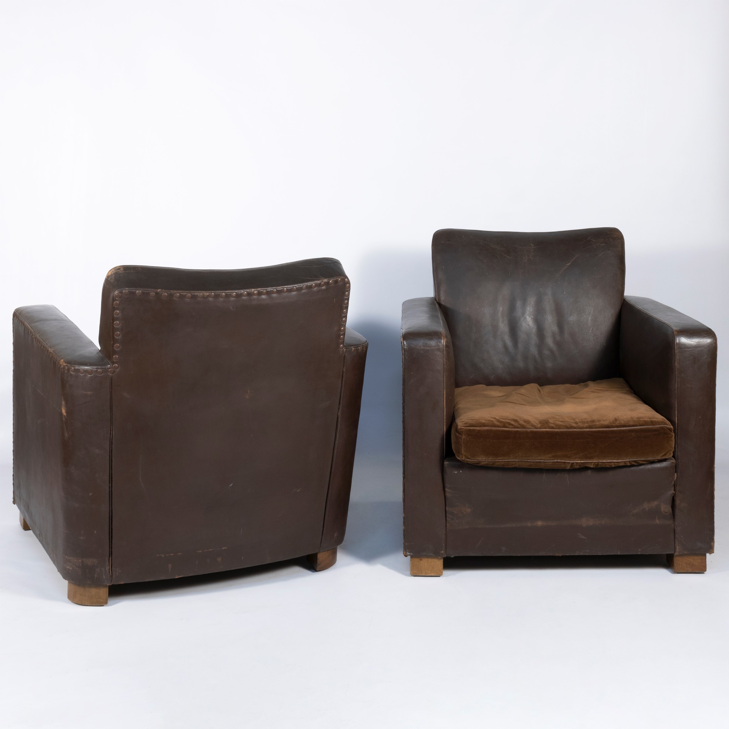 80x77x80 cm.Pair of armchairs in padded leather, wood and padded fabric, wears
