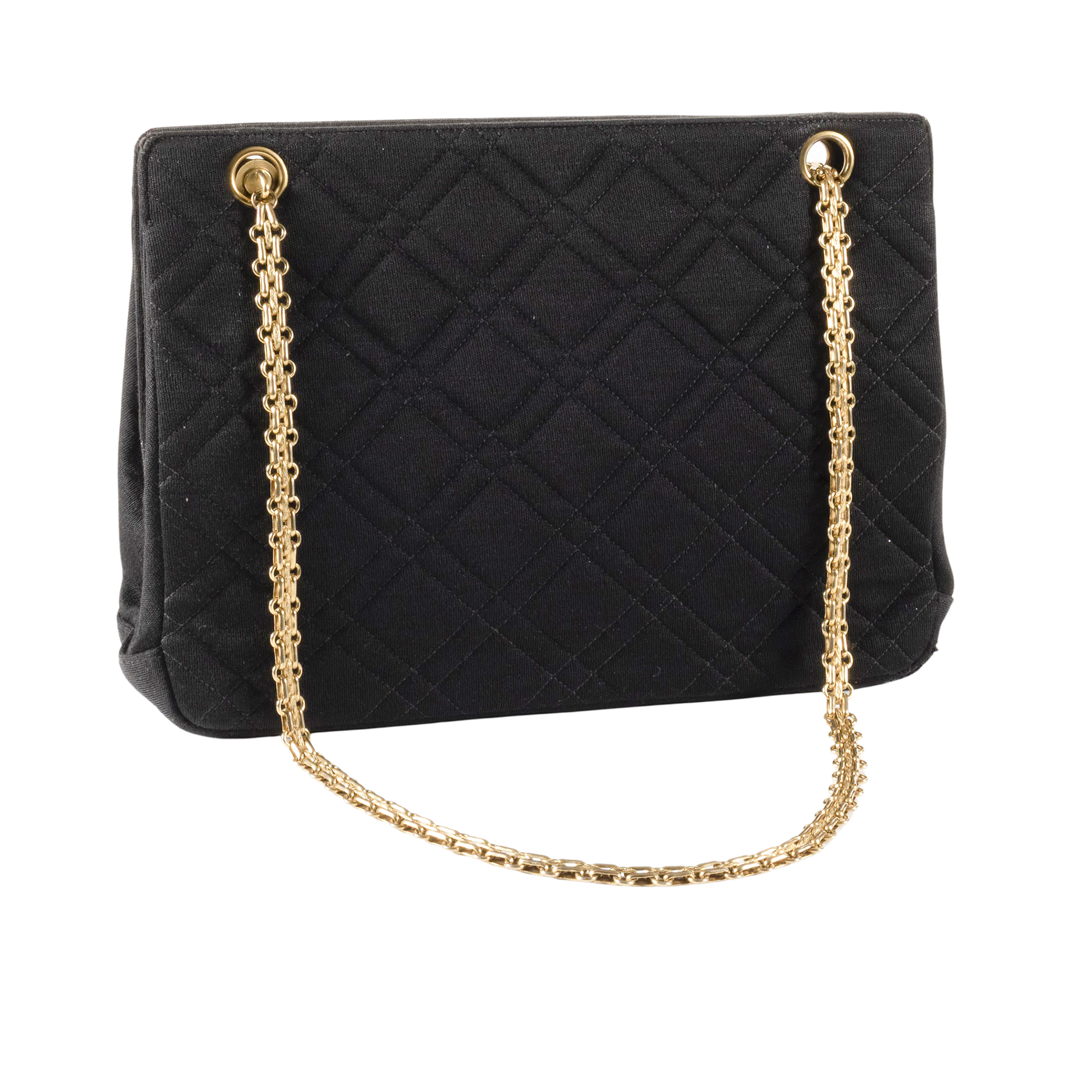 in black canvas, golden finishes, canvas interior with one compartment with two pockets, zip closure, chain shoulder strap, some signs of wear