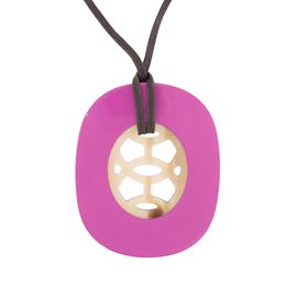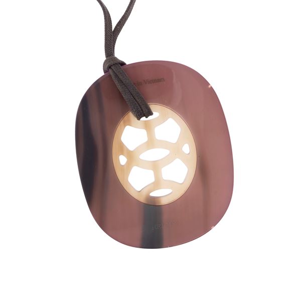 in pink lacquered horn, dimensions 8.5x6.8 cm. Some signs of wear, fabric lace, maximum adjustable length 72 cm. complete with case