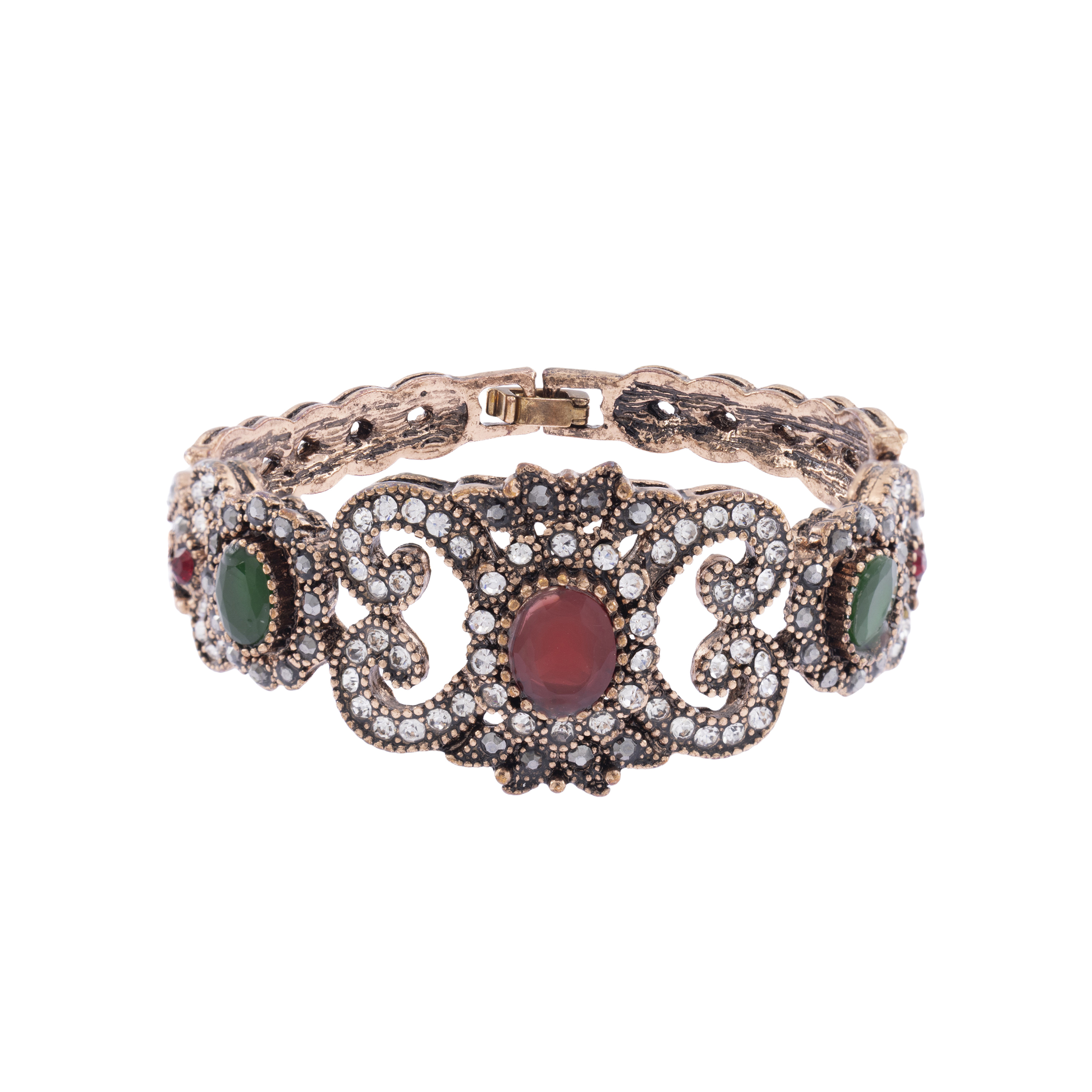 in golden metal, zircons and glass pastes, diameter 6 cm.