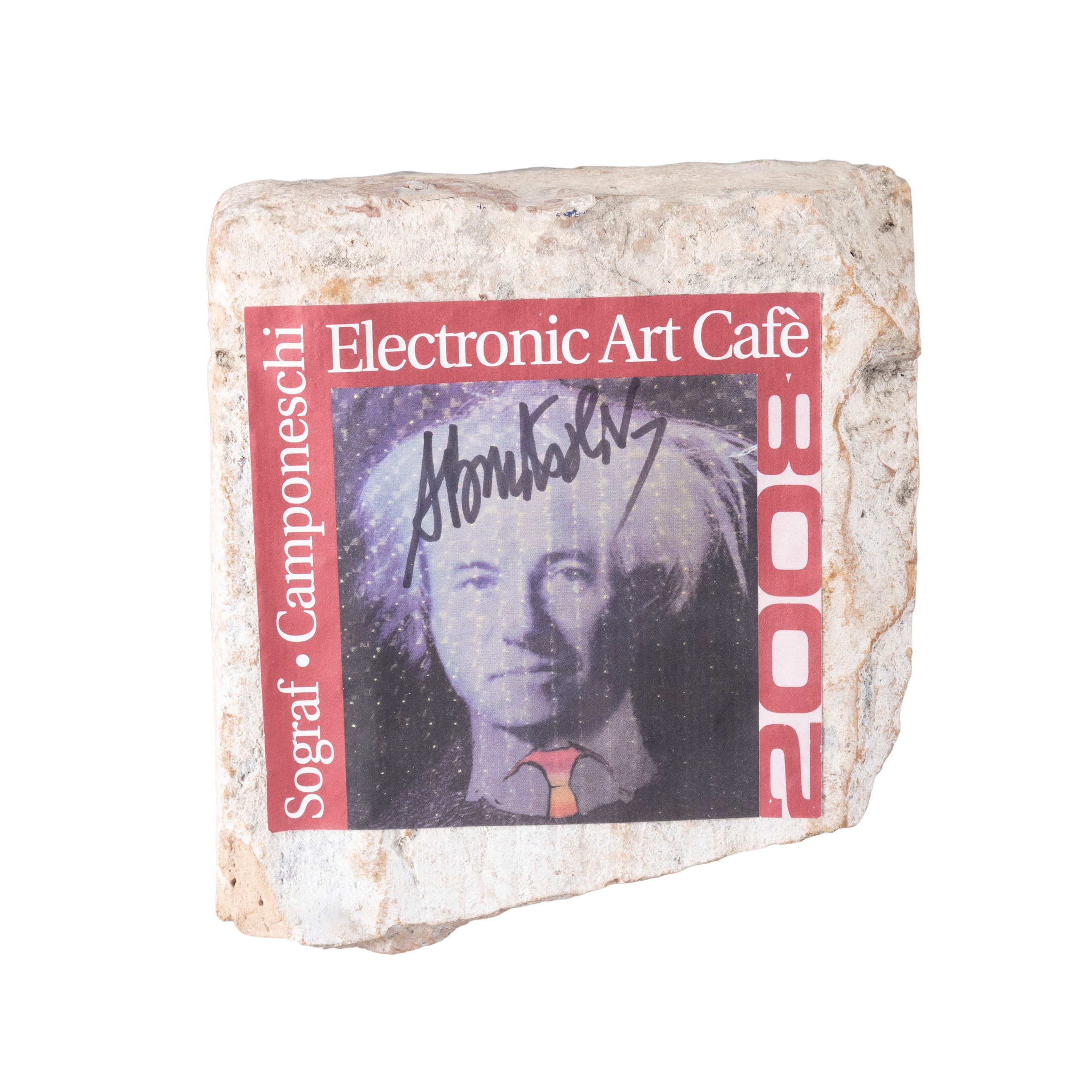 "Untitled", 2008, collage on brick, signed on the front Exhibition: "Nascondi la pietra, che Caino non la trovi", a cura dell'Associazione Nessuno Tocchi Caino e Vincenzo Mazzarella, Galleria Monserrato Arte '900, Roma 2008, Torre Viscontea, Lecco 2011, Sede del Partito Radicala, Roma 2019