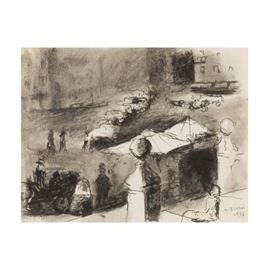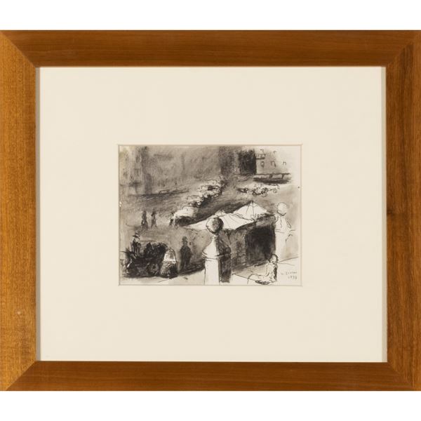 "Piazza di Spagna", 1937, Indian ink and watercolor on paper, signed and dated lower right, within frame
