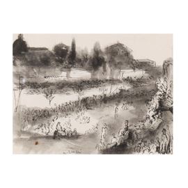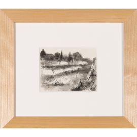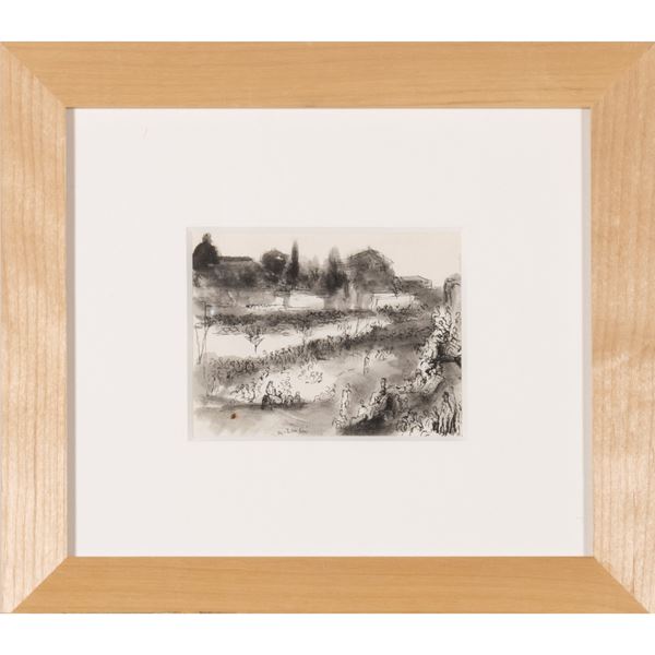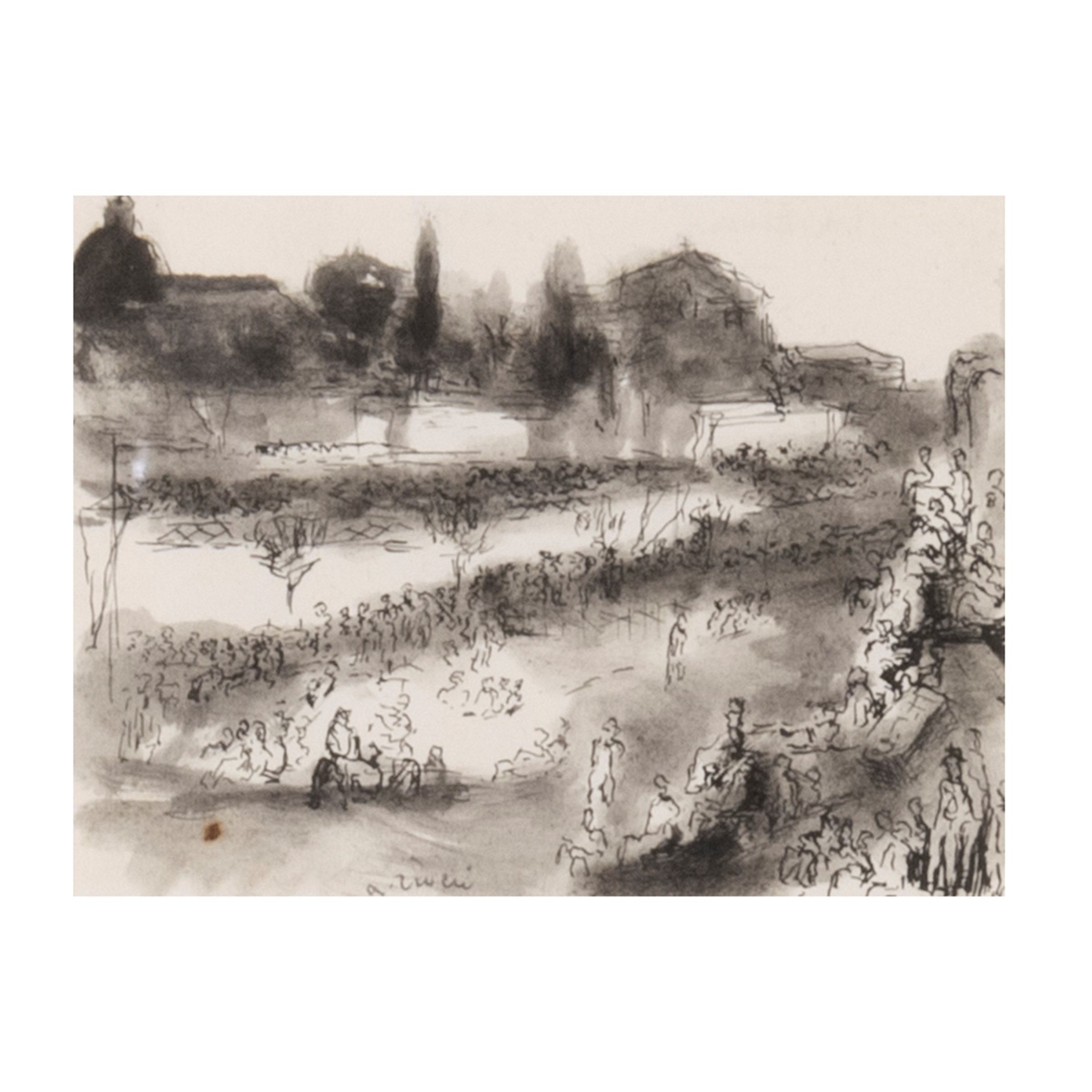 11x15 cm."Sul Tevere", 1938 ca., Indian ink and watercolor on paper, signed at the bottom of the center, within frame