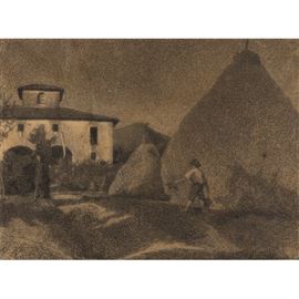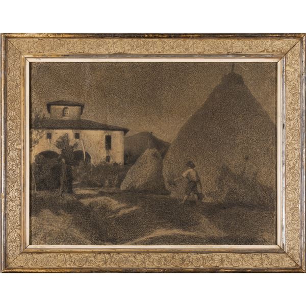35x48 cm."Casa colonica", 1928, charcoal on paper, signed and dated lower right, titled on the back, within frame