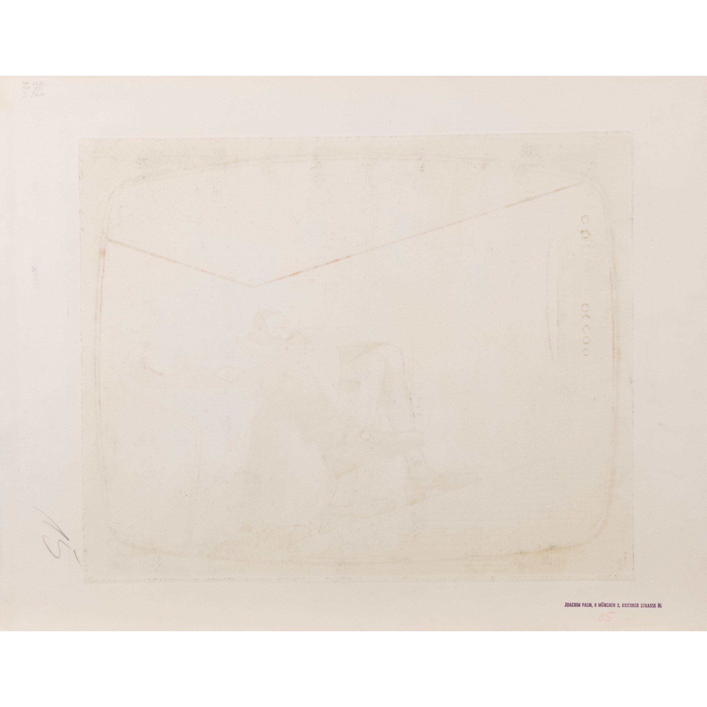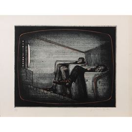 "In front of television", color etching, eg. 12/XV, signed at the bottom right, stamp of the artist on the back, free sheet