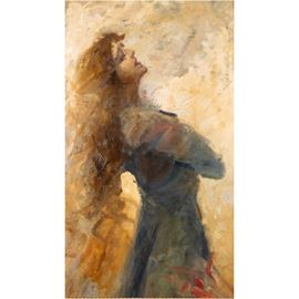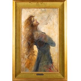 46x26.5 cm."Profile of young woman", oil on panel, within frame.