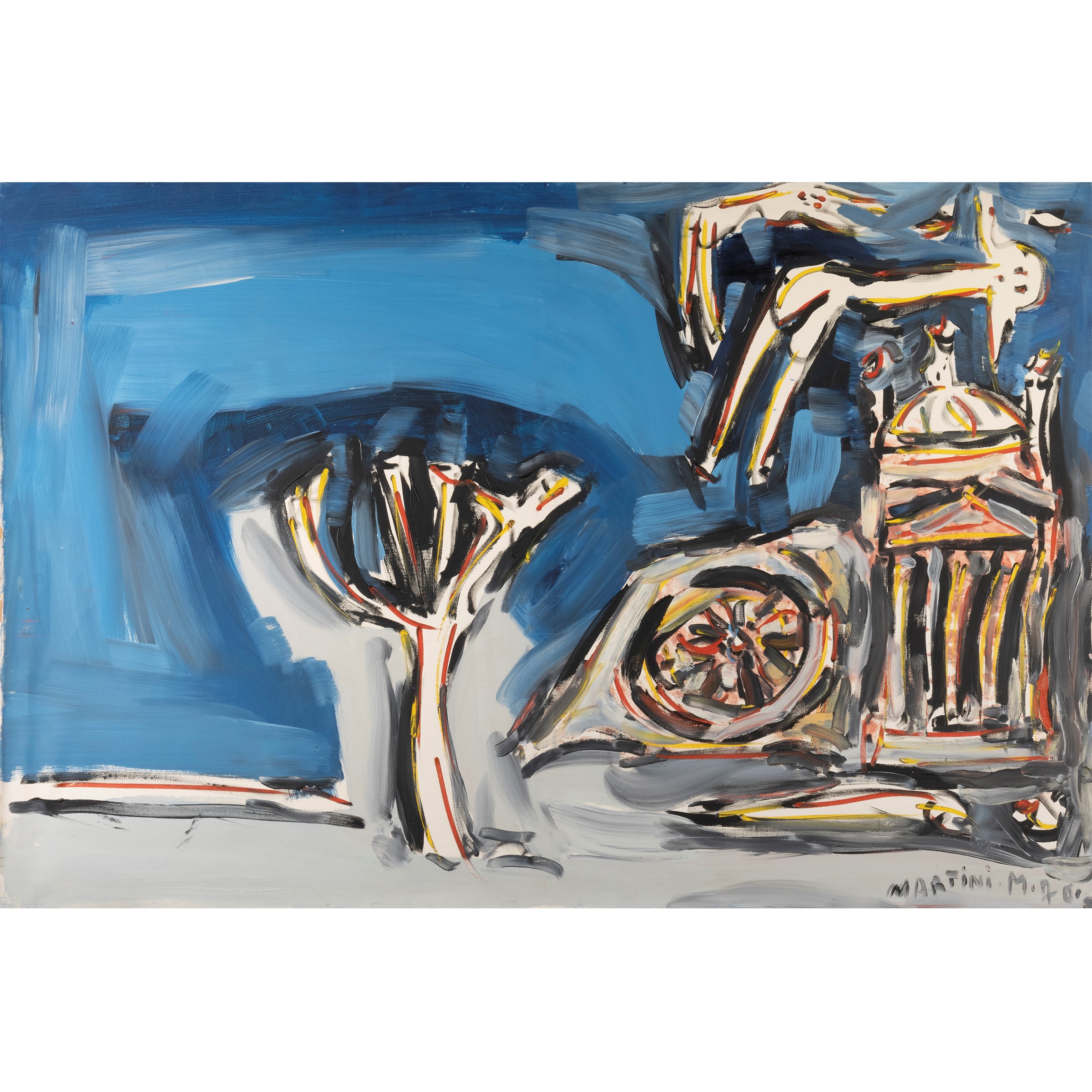 100x150 cm."Paesaggio con basilica e figure", 1976, oil on canvas, signed and dated in the bottom right