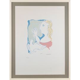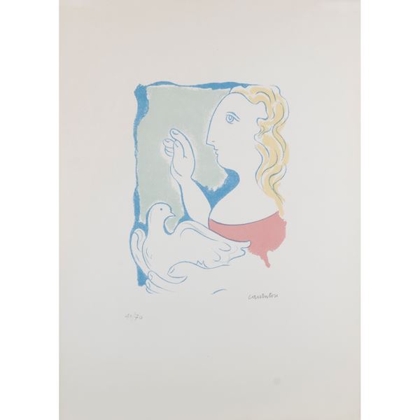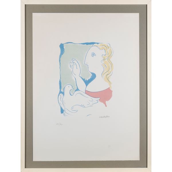 67x48 cm."Donna con colomba", color lithography, eg. 40/70, signed lower right, dry stamp "Il Torchio, Milan" lower right, within frame