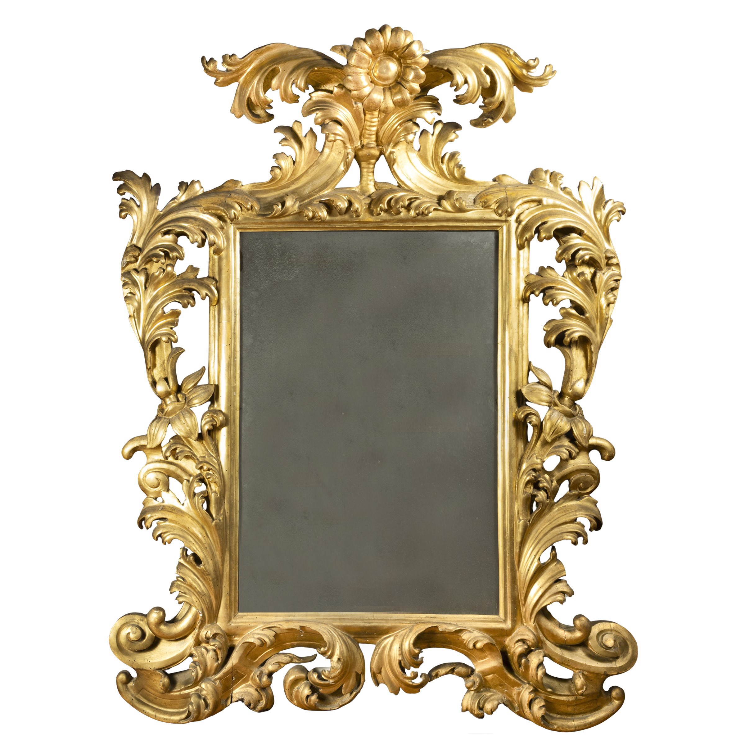157x125 cm.rectangular frame with lateral elements decorated with scrolls and floral motifs, cimasa with rich floral decoration, wears and losses