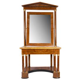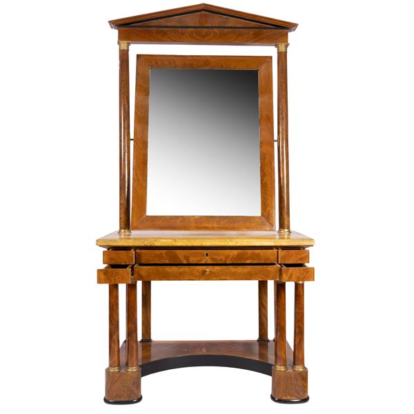 216x111x53 cm.console with rectangular top in yellow marble and drawers underneath, double column supports with gilded bronze capitals joined by a cross, tilting mirror with tympanum, delimited by two columns with gilded bronze capitals, wears