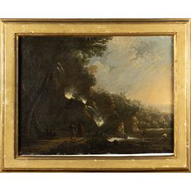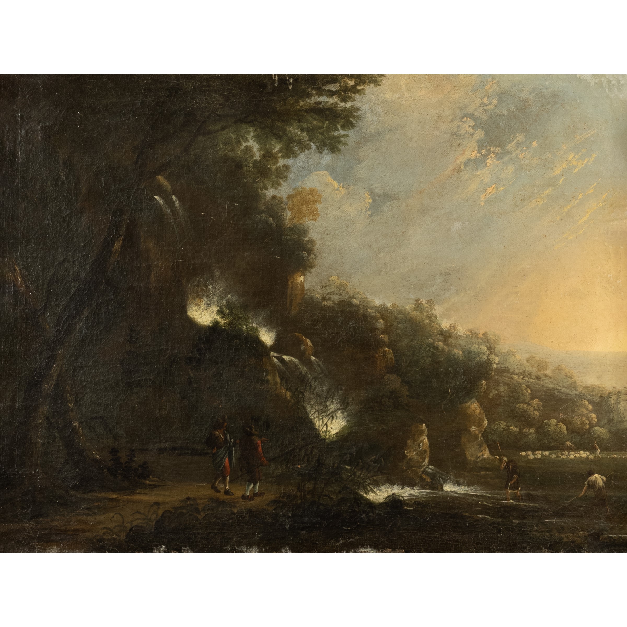 49x66 cm."Landscape with waterfall and fishermen", oil on canvas, within a lacquered and gilded wooden frame