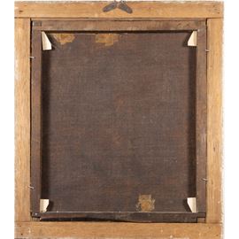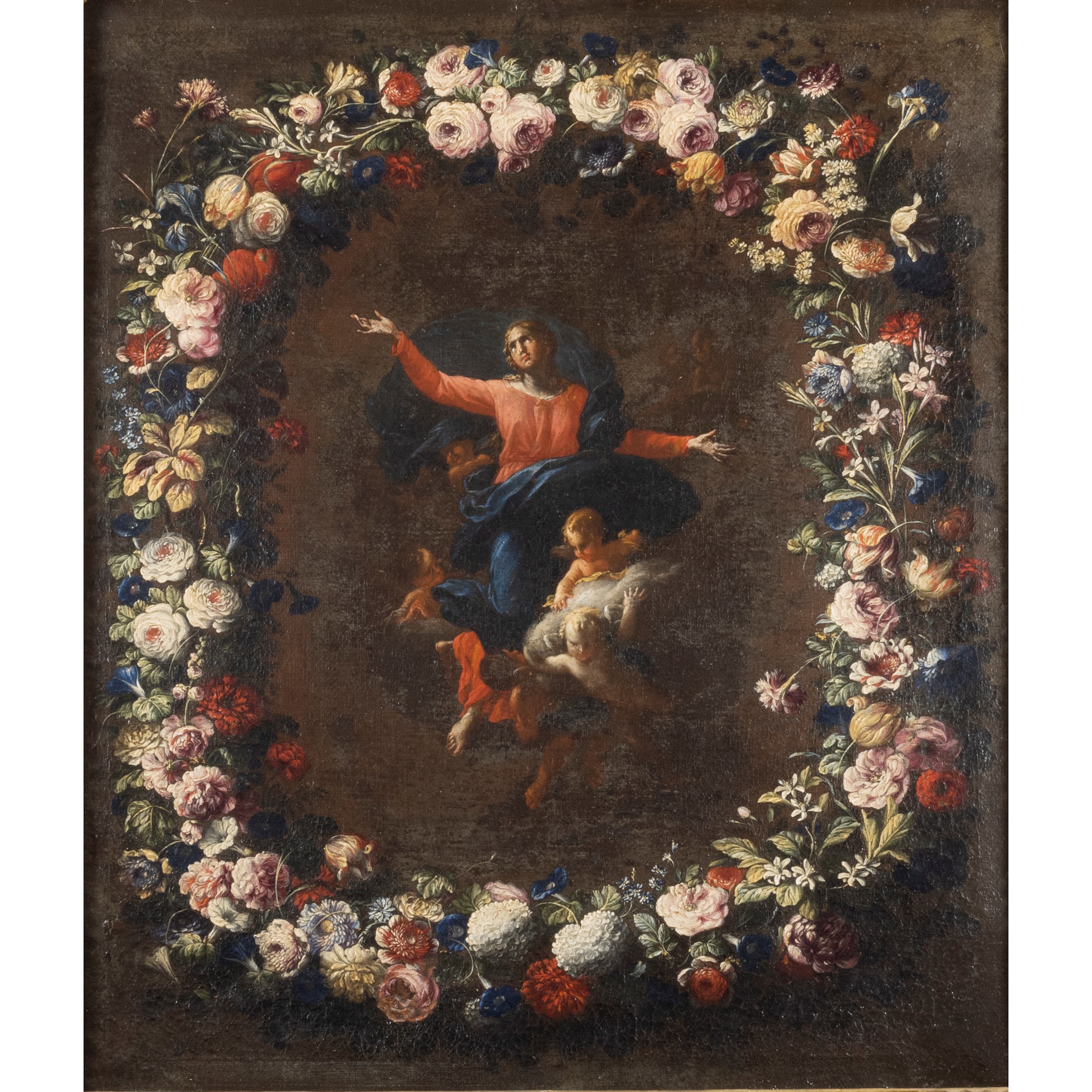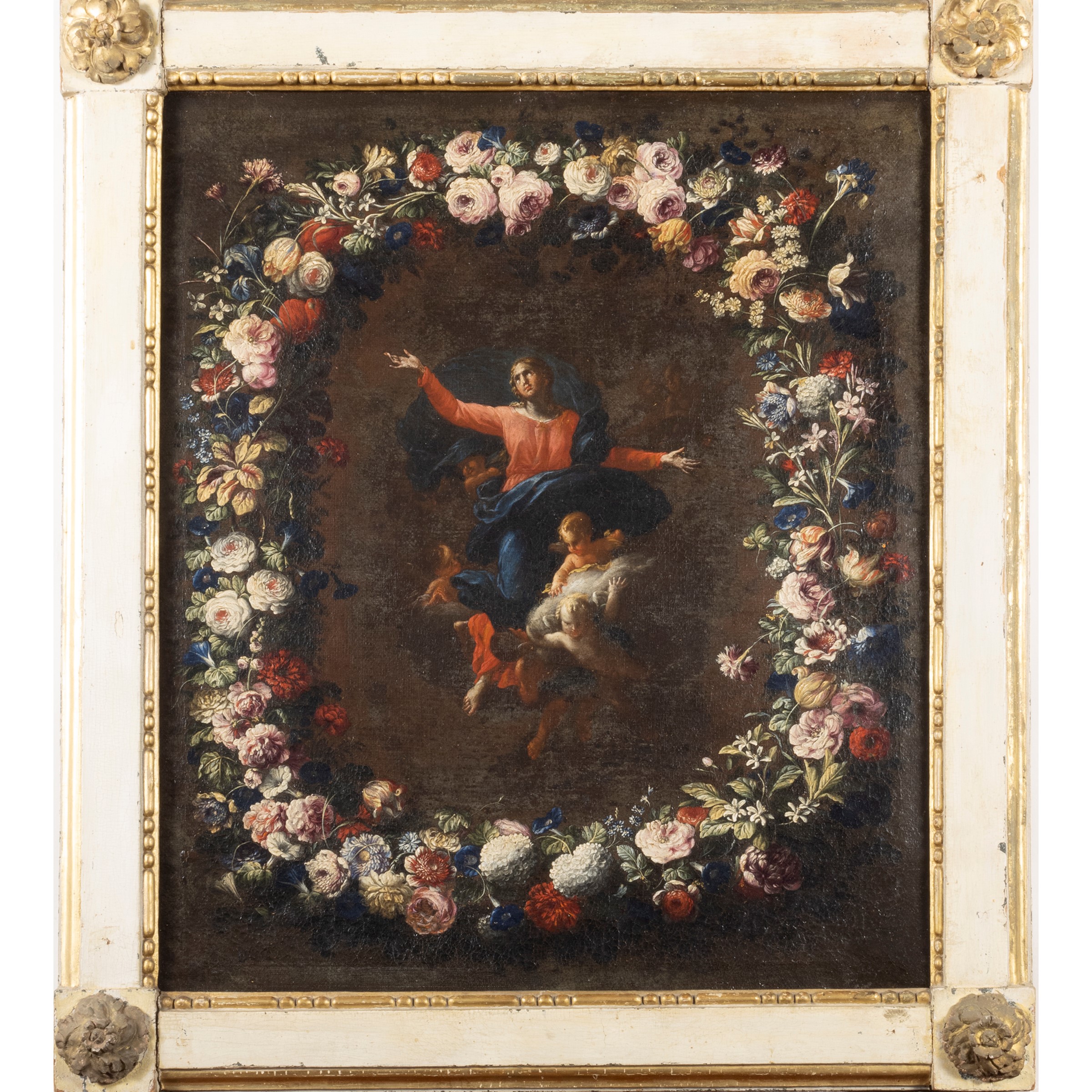 "Madonna in glory with a garland of flowers", oil on canvas, framed