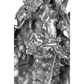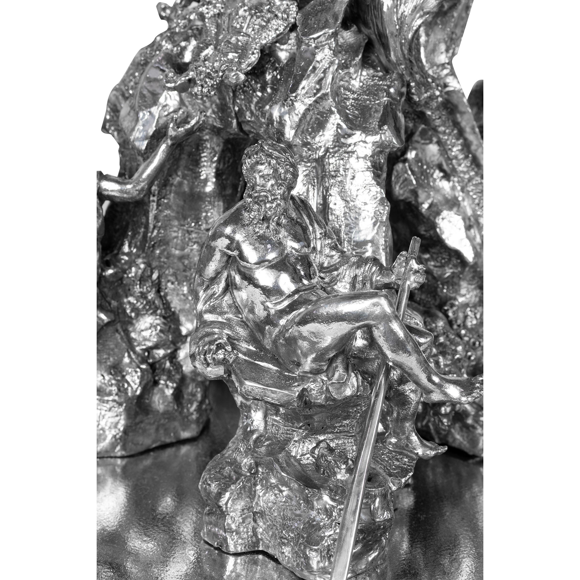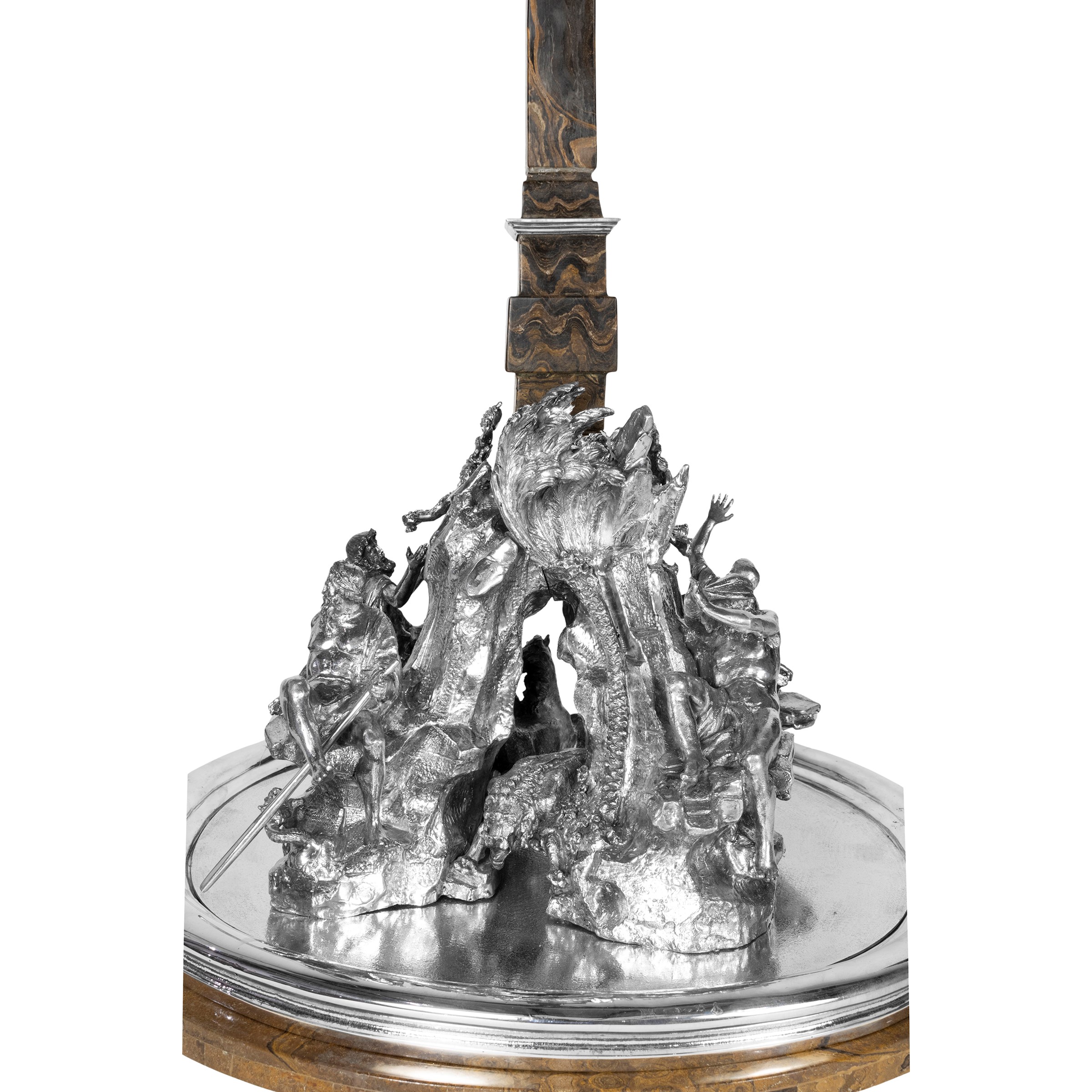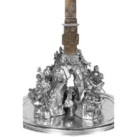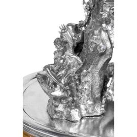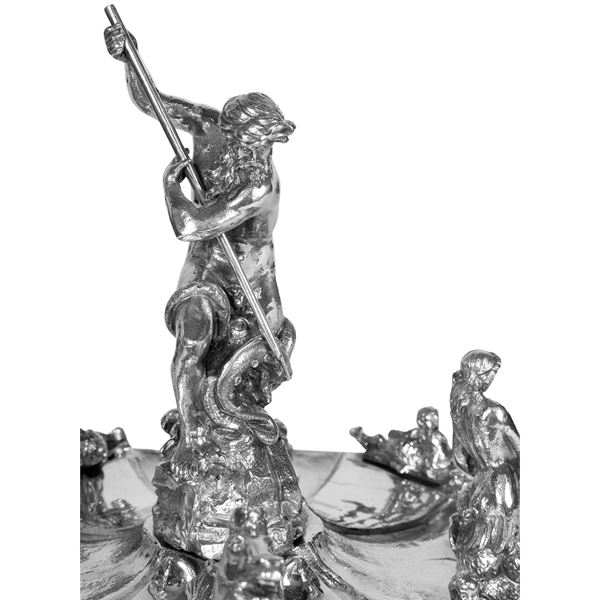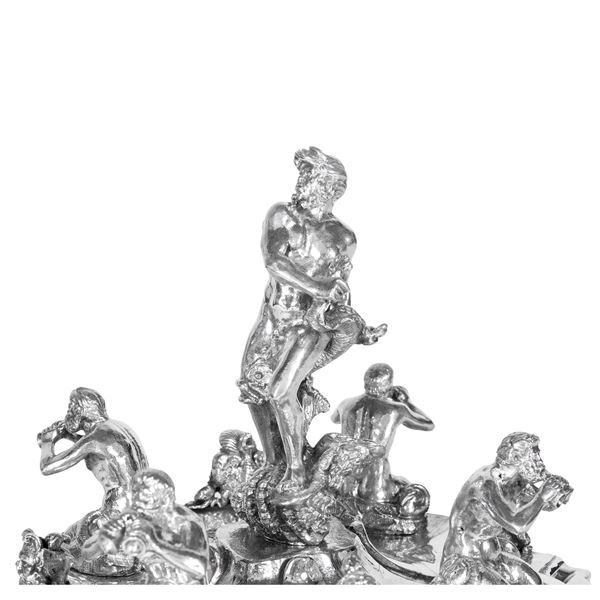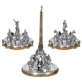 77x44x40 cm. - 24x34x38 cm. - 24x34x38 cm.important surtout de table in silver and marble base, depicting the three Bernini fountains in Piazza Navona in Rome: Fontana dei Quattro Fiumi, Fontana del Moro, and Fontana del Nettuno, bears mark of Mortet Rome workshop, net weight circa 15,560 kg