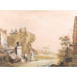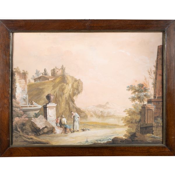 44x58.5 cm."Landscape with architecture and figures", tempera on paper applied to canvas, within a frame