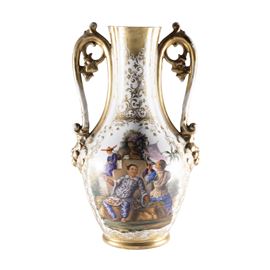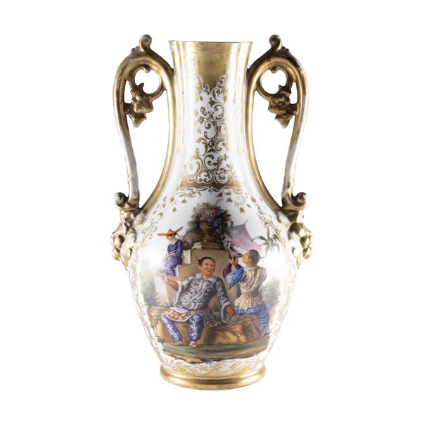 39x22 cm.oval body with shaped handles, decorated on both sides with oriental-style scenes within shaped reserves