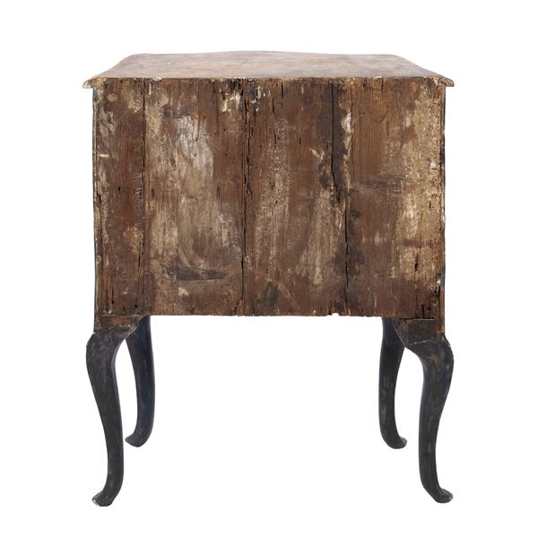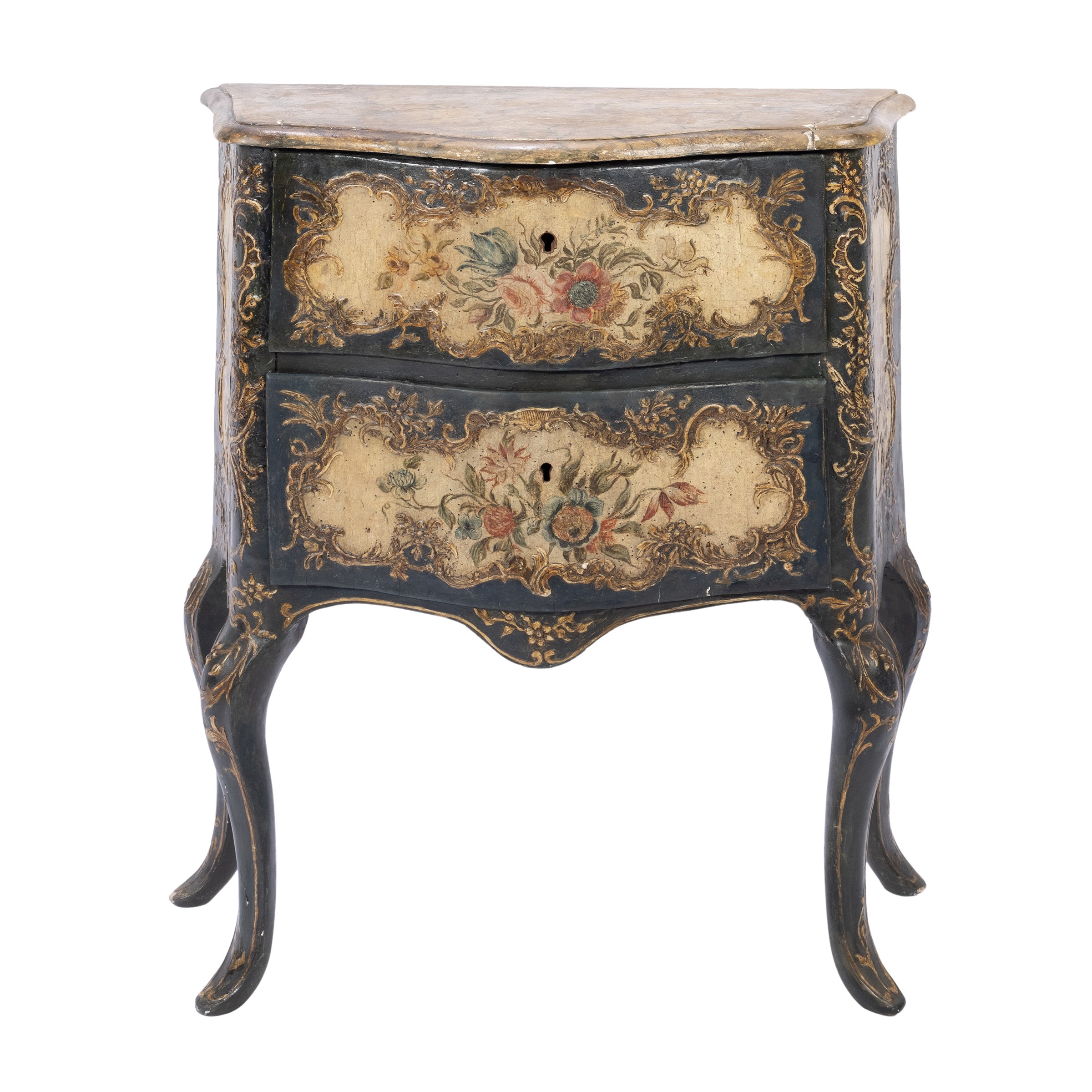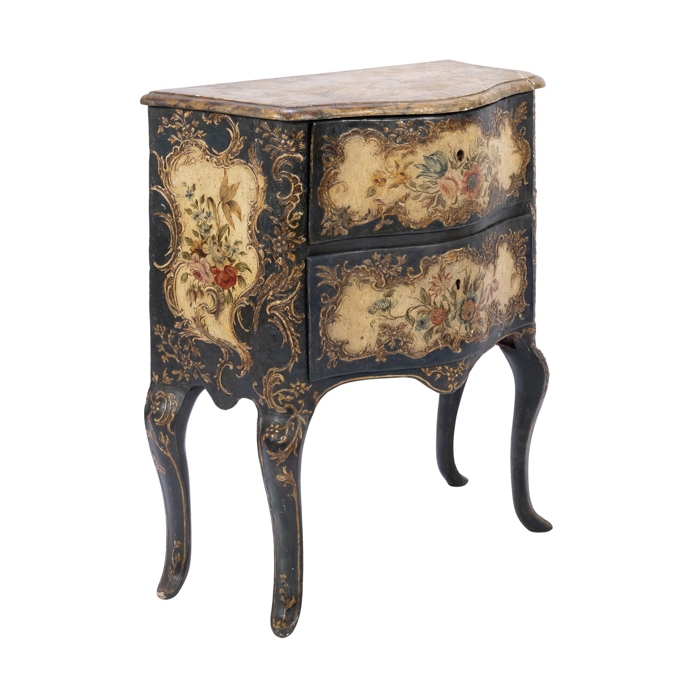 79.5x64x34 cm.79.5x64xfront with two drawers, entirely decorated with polychrome floral compositions within rocaille cartouches worked in pastille, shaped legs, shaped wooden top worked to imitate marble, wears and defects.