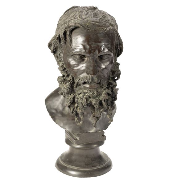 h. 53 cm."The philosopher", 1883, patinated bronze sculpture, signed on the back, Gemito foundry mark on the back, resting on a circular base.
